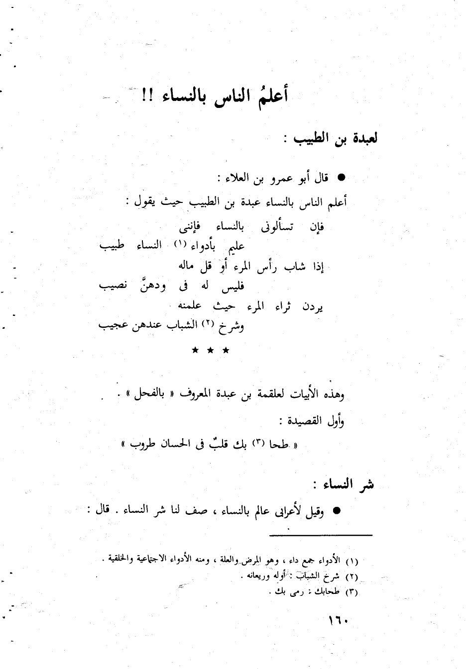 أعلم النَّاس بِالنسَاء لعبدة بن الطّيب قَالَ أَبُو عَمْرو بن الْعَلَاء اعْلَم النَّاس بِالنسَاء عَبدة بن الطَّبِيب حَيْثُ يَقُول فَإِن تسألونى بِالنسَاء فإننى عليم بأدواء النِّسَاء طَبِيب إِذا شَاب رَأس الْمَرْء أَو قل مَاله فَلَيْسَ لَهُ فِي ودهن نصيب يردن ثراء الْمَرْء حَيْثُ علمنه وشرخ الشَّبَاب عِنْدهن عَجِيب وَهَذِه الأبيات لعلقمة بن عَبدة الْمَعْرُوف بالفحل وَأول القصيدة طحا بك قلب فى الحسان طروب شَرّ النِّسَاء وَقيل لأعرابي عَالم بِالنسَاء صف لنا شَرّ النِّسَاء قَالَ