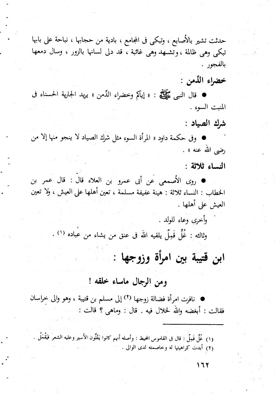 حدثت تُشِير بالأصابع وتبكى فِي المجامع بادية من حجابها نباحة على بَابهَا تبكى وهى ظالمة وَتشهد وهى غَائِبَة قد دلى لسانها بالزور وسال دمعها بِالْفُجُورِ خضراء الدمن قَالَ النَّبِي إيَّاكُمْ وخضراء الدمن يُرِيد الْجَارِيَة الْحَسْنَاء فى المنبت السوء شرك الصياد وفى حِكْمَة دَاوُد الْمَرْأَة السوء مثل شرك الصياد لَا ينجو مِنْهَا إِلَّا من رَضِي الله عَنهُ النِّسَاء ثَلَاثَة روى الأصمعى عَن أبي عَمْرو بن الْعَلَاء قَالَ قَالَ عمر بن الْخطاب النِّسَاء ثَلَاثَة هينة عفيفة مسلمة تعين أَهلهَا على الْعَيْش وَلَا تعين الْعَيْش على اهلها وَأُخْرَى وعَاء للْوَلَد وثالثه غل قمل يلقيه الله فى عنق من يَشَاء من عباده ابْن قُتَيْبَة بَين امْرَأَة وَزوجهَا وَمن الرِّجَال مَا سَاءَ خلقه نافرت امْرَأَة فضَالة زَوجهَا إِلَى مُسلم بن قُتَيْبَة وَهُوَ والى خُرَاسَان فَقَالَت أبغضه وَالله لخلال فِيهِ قَالَ وَمَا هى قَالَت