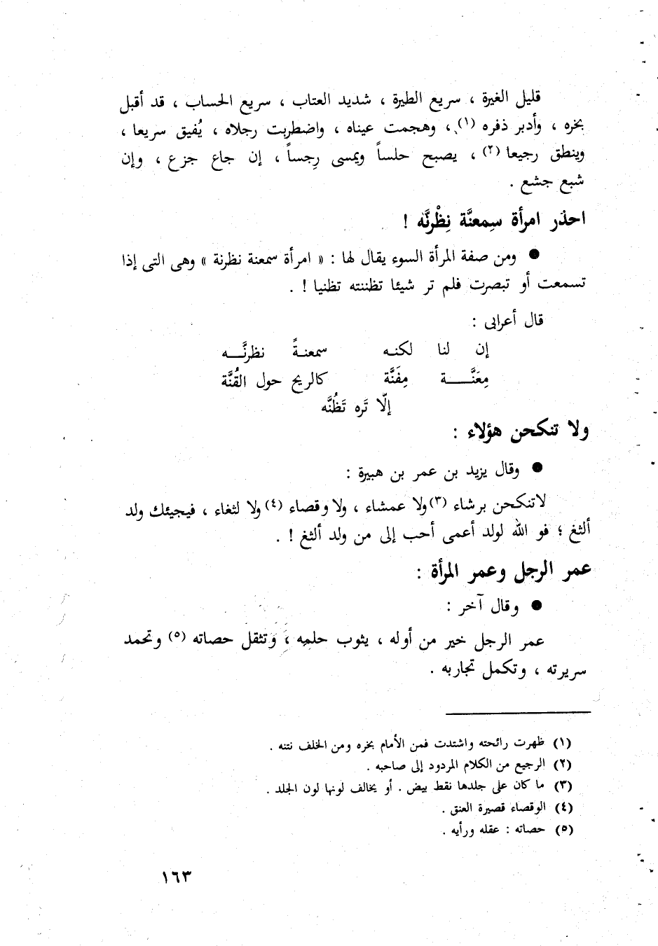 قَلِيل الْغيرَة سريع الطَّيرَة شَدِيد العتاب سريع الْحساب قد أقبل بخره وَأدبر ذفره وهجمت عَيناهُ واضربت رِجْلَاهُ يفِيق سَرِيعا وينطق رجيعا يصبح حلسا ويمسة رجسا إِن جَاع جزع وَإِن شبع جشع احذر امْرَأَة سمعنة نظرنه وَمن صفة الْمَرْأَة السوء يُقَال لَهَا امْرَأَة مسعنة نظرنة وهى الَّتِى إِذا تسمعت أَو تبصرت فَلم تَرَ شَيْئا تظننته تظنيا قَالَ أعرابى إِن لنا لكنه سمعنة نظرنه معنة مفنة القنة إِلَّا تره تظنه وَلَا تنكحن هَؤُلَاءِ وَقَالَ يزِيد بن عمر بن هُبَيْرَة لَا تنكحن برشاء وَلَا عمشاء وَلَا وقصاء وَلَا لثغاء فيجيئك ولد ألثغ فوَاللَّه لولد أعمى أحب إِلَى من ولد ألثغ عمر الرجل وَعمر الْمَرْأَة وَقَالَ آخر عمر الرجل خير من أَوله يثوب حلمه وتثقل حصاته وتحمد سَرِيرَته وتكمل تجاربه