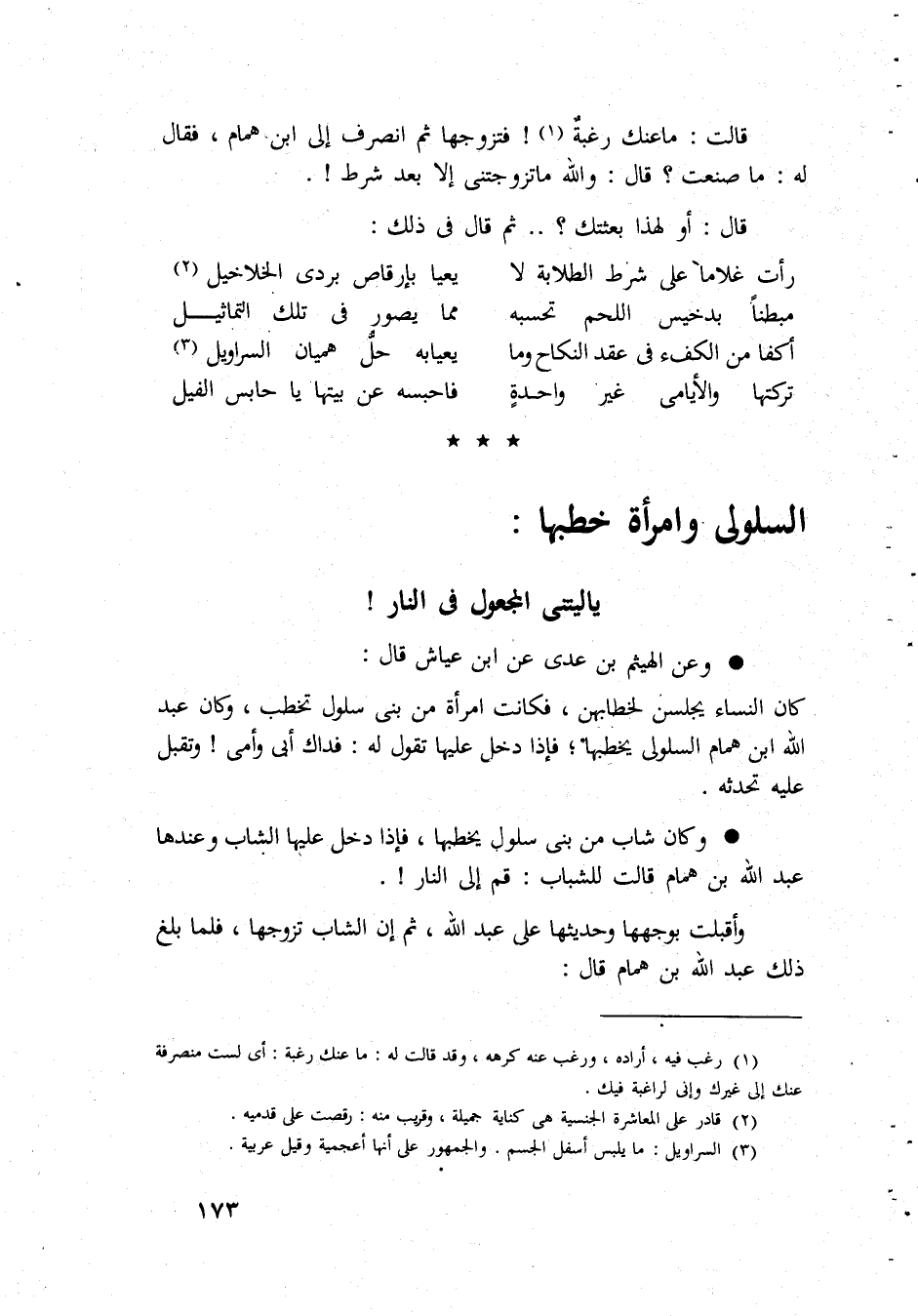 قَالَت مَا عَنْك رَغْبَة فَتَزَوجهَا ثمَّ انْصَرف إِلَى ابْن همام فَقَالَ لَهُ مَا صنعت قَالَ وَالله مَا تزوجتنى إِلَّا بِشَرْط بعد شَرط قَالَ أَو لهَذَا بَعَثْتُك ثمَّ قَالَ فِي ذَلِك رَأَتْ غُلَاما على شَرط الطلابة لَا يعيا بإرقاص بردى الخلاخيل مبطنا بدخيس اللَّحْم تحسبه مِمَّا يصور فى تِلْكَ التماثيل أكفا من الْكُفْء فى عقد النِّكَاح وَمَا يعيابه حل هميان السَّرَاوِيل تركتهَا والأيامى غير وَاحِدَة فاحبسه عَن بَيتهَا يَا حَابِس الْفِيل السلولى وَامْرَأَة خطبهَا يَا ليتنى المجعول فِي النَّار وَعَن الْهَيْثَم بن عدى عَن ابْن عَيَّاش قَالَ كَانَ النِّسَاء يجلسن لخطابهن فَكَانَت امْرَأَة من بنى سلول تخْطب وَكَانَ عبد الله ابْن همام السلولى يخطبها فَإِذا دخل عَلَيْهَا تَقول لَهُ فدَاك أَبى وأمى وَتقبل عَلَيْهِ تحدثه وَكَانَ شَاب من بنى سلول يخطبها فَإِذا دخل عَلَيْهَا الشَّاب وَعِنْدهَا عبد الله بن همام قَالَت للشباب قُم إِلَى النَّار وَأَقْبَلت بوجهها وحديثها على عبد الله ثمَّ إِن الشَّاب تزَوجهَا فَلَمَّا بلغ ذَلِك عبد الله بن همام قَالَ
