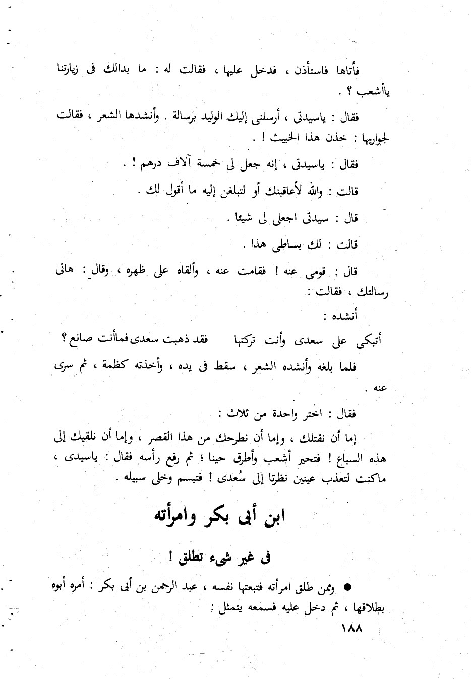 فَأَتَاهَا فَاسْتَأْذن فَدخل عَلَيْهَا فَقَالَت لَهُ مَا بدالك فى زيارتنا يَا أشعب فَقَالَ يَا سيدتى أرسلنى إِلَيْك الْوَلِيد برسالة وأنشدها الشّعْر فَقَالَت لجواريها خذن هَذَا الْخَبيث فَقَالَ يَا سيدتى أرسلنى إِلَيْك الْوَلِيد برسالة وأنشدها الشّعْر فَقَالَت لجواريها خذن هَذَا الْخَبيث فَقَالَ يَا سيدى إِنَّه جعل لى خَمْسَة آلَاف دِرْهَم قَالَت وَالله لأعاقبن أَو لتبلغن إِلَيْهِ مَا أَقُول لَك قَالَ سيدتى اجعلى شَيْئا قَالَت لَك بساطى هَذَا قَالَ قومى عَنهُ فَقَامَتْ عَنهُ وألقاه على ظَهره وَقَالَ هاتى رِسَالَتك فَقَالَت أنْشدهُ أتبكى على سعدى وَأَنت تركتهَا فقد ذهبت سعدى فَمَا أَنْت صانع فَلَمَّا بلغه وأنشده الشّعْر سقط فى يَده وأخذته كظمة ثمَّ سرى عَنهُ فَقَالَ اختر وَاحِدَة من ثَلَاث إِمَّا ان نقتلك وَإِمَّا أَن نطرحك من هَذَا الْقصر وَإِمَّا أَن نلقيك إِلَى هَذِه السبَاع فتحير اشعب وأطرق حينا ثمَّ رفع رَأسه فَقَالَ يَا سيدى مَا كنت لتعذب عينين نظرتا إِلَى سعدى فَتَبَسَّمَ وخلى سَبيله ابْن أَبى بكر وَامْرَأَته فِي غير شىء تطلق وَمِمَّنْ طلق امْرَأَته فتبعتها نَفسه عبد الرَّحْمَن بن أَبى بكر أمره أَبوهُ بِطَلَاقِهَا ثمَّ دخل عَلَيْهِ فَسَمعهُ يتَمَثَّل