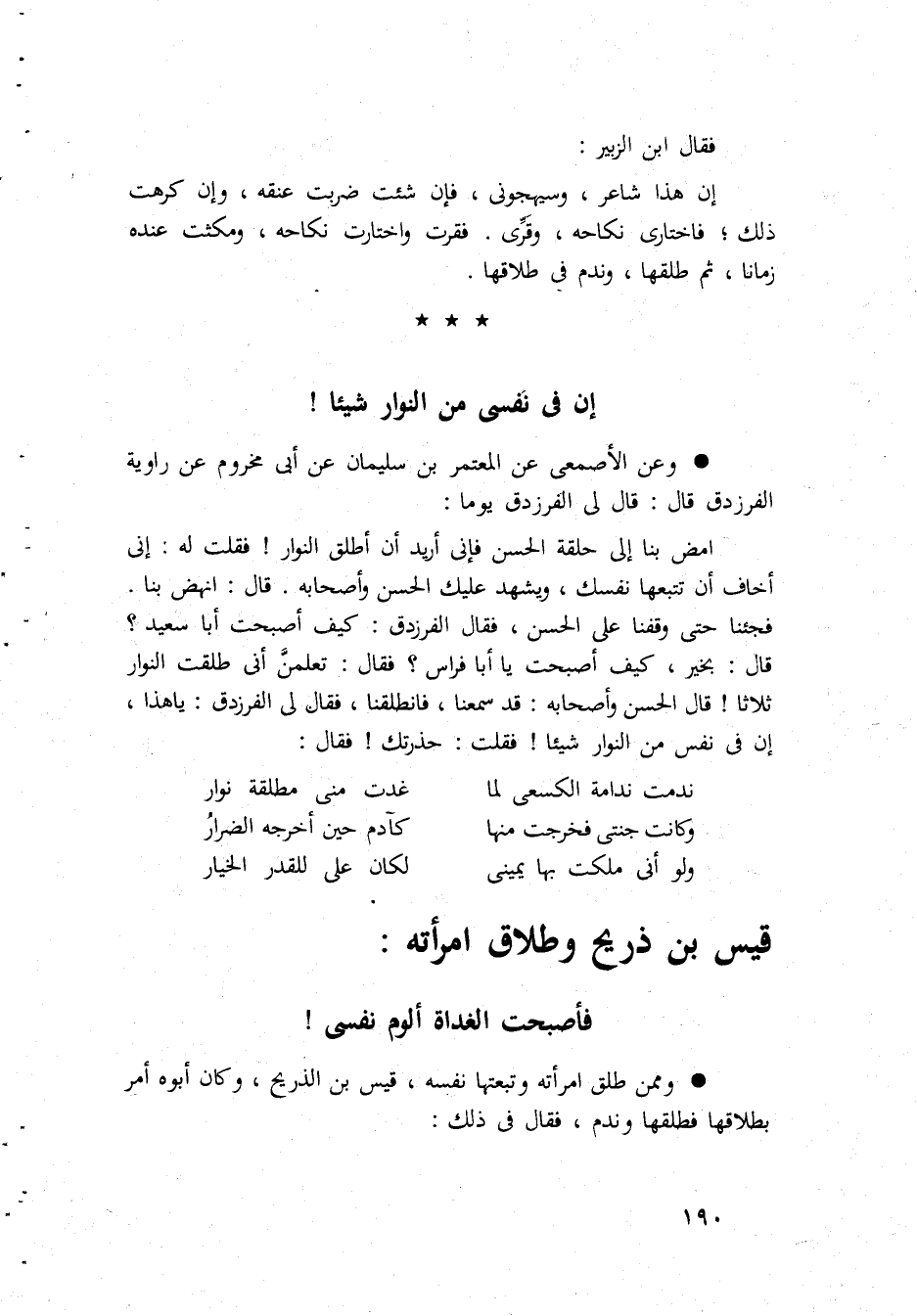 فَقَالَ ابْن الزبير إِن هَذَا شَاعِر وسيهجونى فَإِن شِئْت ضربت عُنُقه وَإِن كرهت ذَلِك فاختاري نِكَاحه وقرى فقرت واختارت نِكَاحه وَمَكَثت عِنْده زَمَانا ثمَّ طَلقهَا وَنَدم فى طَلاقهَا إِن فى نفسى من النوار شَيْئا وَعَن الاصمعى عَن الْمُعْتَمِر بن سُلَيْمَان عَن أَبى مخروم عَن راوية الفرزدق قَالَ قَالَ لى الفرزدق يَوْمًا امْضِ بِنَا إِلَى حَلقَة الْحسن فإنى أُرِيد أَن اطلق النوار فَقلت لَهُ إنى أَخَاف أَن تتبعها نَفسك وَيشْهد عَلَيْك الْحسن وَأَصْحَابه قَالَ انهض بِنَا فَجِئْنَا حَتَّى وقفنا على الْحسن فَقَالَ الفرزدق كَيفَ أَصبَحت أَبَا سعيد قَالَ بِخَير كَيفَ أَصبَحت يَا أَبَا فراس فَقَالَ تعلمن أَنى طلقت النوار ثَلَاثًا قَالَ الْحسن وَأَصْحَابه قد سمعنَا فَانْطَلَقْنَا فَقَالَ لى الفرزدق يَا هَذَا إِن فى نفس من النوار شَيْئا فَقلت حذرتك فَقَالَ نَدِمت ندامة الكسعى لما غَدَتْ منى مُطلقَة نوار وَكَانَت حنتى فَخرجت مِنْهَا كآدم حِين اخرجه الضرار وَلَو أَنى ملكت بهَا يمينى لَكَانَ على للقدر الْخِيَار قيس بن ذريح وَطَلَاق امْرَأَته فَأَصْبَحت الْغَدَاة ألوم نفسى وَمِمَّنْ طلق امْرَأَته وتبعها نَفسه قيس بن الذريح وَكَانَ أَبوهُ أَمر بِطَلَاقِهَا فَطلقهَا وَنَدم فَقَالَ فى ذَلِك