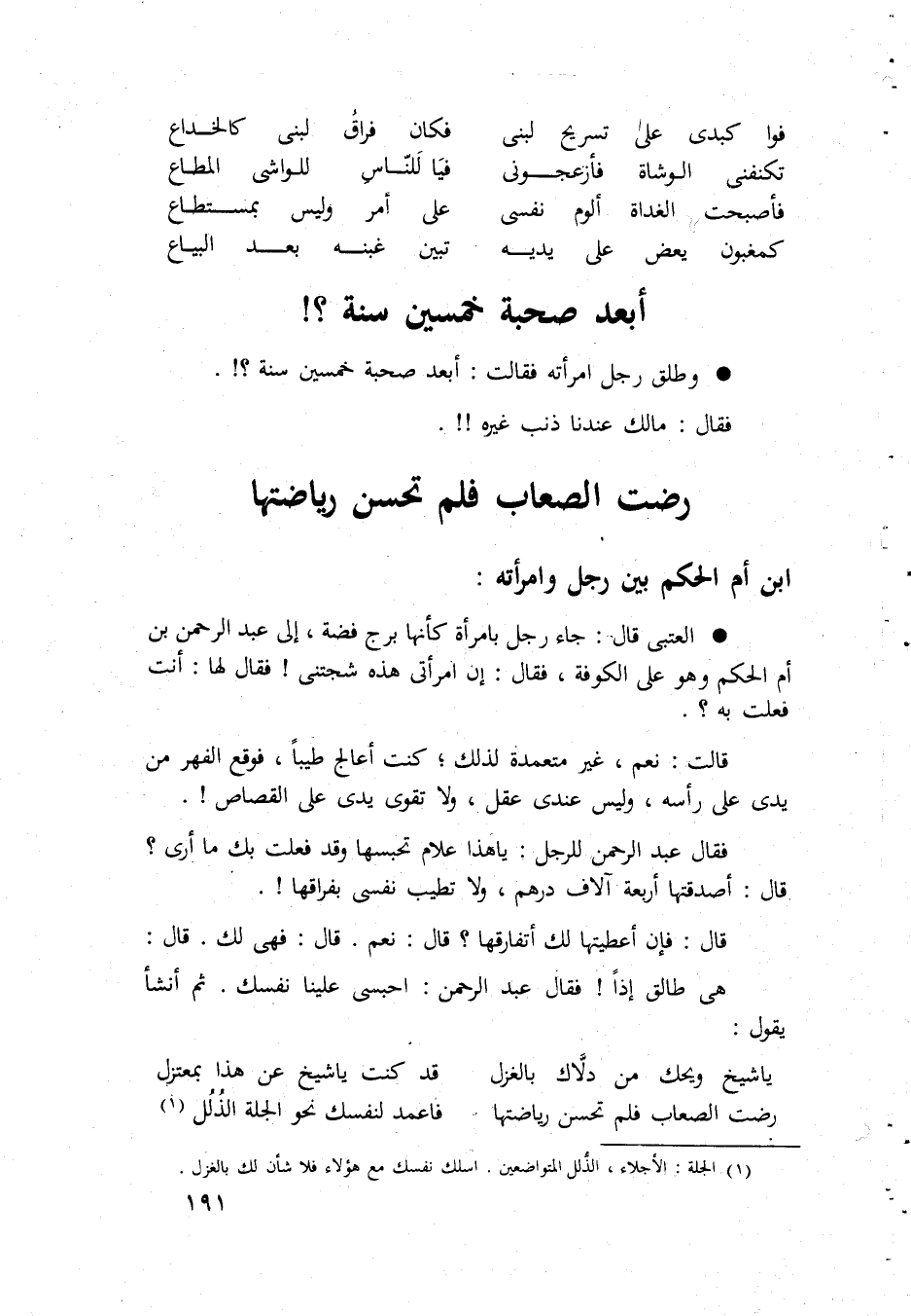 فوا كبدى على تَسْرِيح لبنى فَكَانَ فِرَاق لبنى كالخداع تكنفنى الوشاة فأزعجونى فيا للنَّاس للواشى المطاع فَأَصْبَحت الْغَدَاة ألوم نفسى على أَمر وَلَيْسَ بمستطاع كمغبون يعَض على يَدَيْهِ تبين غبنه بعد البياع أبعد صُحْبَة خمسين سنة وطلق رجل امْرَأَته فَقَالَت أبعد صُحْبَة خمسين سنة فَقَالَ مَالك عندنَا ذَنْب غَيره رضت الصعاب فَلم تحسن رياضتها ابْن أم الحكم بَين رجل وَامْرَأَته العتبى قَالَ جَاءَ رجل بِامْرَأَة كَأَنَّهَا برج فضَّة لى عبد الرَّحْمَن بن أم الحكم وَهُوَ على الْكُوفَة فَقَالَ أَن امرأتى هَذِه شجتنى فَقَالَ لَهَا أَنْت فعلت لَهُ قَالَت نعم غير متعمدة لذَلِك كنت أعالج طيبا فَوَقع الفهر من يدى على رَأسه وَلَيْسَ عندى عقل وَلَا تقوى يدى على الْقصاص فَقَالَ عبد الرَّحْمَن للرجل يَا هَذَا علام تحبسها وَقد فعلت بك مَا أرا قَالَ أَصدقتهَا أَرْبَعَة آلَاف دِرْهَم وَلَا تطيب نفسى بفراقها قَالَ فَإِن أعطيتهَا لَك أتفارقها قَالَ نعم قَالَ فهى لَك قَالَ هى طَالِق إِذا فَقَالَ عبد الرَّحْمَن احبسى علينا نَفسك ثمَّ أنشأ يَقُول يَا شيخ وَيحك من دلاك بالغزل قد كنت يَا شيخ عَن هَذَا بمعتزل رضت الصعاب فَلم تحسن رياضتها فاعمد لنَفسك نَحْو الجلة الذلل