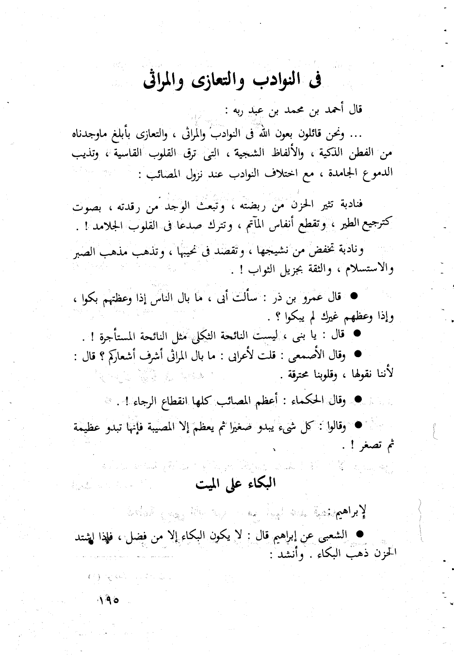 فِي النوادب والتعازى المراثى قَالَ أَحْمد بن مُحَمَّد بن عبد ربه وَنحن قَائِلُونَ بعون الله فِي النوادب المراثى والتعازى بأبلغ مَا وَجَدْنَاهُ من الفطن الذكية والألفاظ الشجية الَّتِى ترق الْقُلُوب القاسية وتذيب الدُّمُوع الجامدة مَعَ اخْتِلَاف النوادب عِنْد نزُول المصائب فنادبة تثير الْحزن من ربضته وتبعث الوجد من رقدته بِصَوْت كترجيع الطير وتقطع أنفاس المآتم يتْرك صدعا فى الْقُلُوب الجلامد ونادبة تخْفض من نشيجها وتقصد فى نحيبها وَتذهب مَذْهَب الصَّبْر والأستسلام والثقة بجزيل الثَّوَاب قَالَ عَمْرو بن ذَر سَأَلت أَبى مَا بَال النَّاس إِذا وعظتهم بكوا وَإِذا وعظهم غَيْرك لم يبكوا قَالَ يَا بنى لَيست النائحة الثكلى مثل النائحة الْمُسْتَأْجرَة وَقَالَ الأصمعة قلت الْأَعرَابِي مَا بَال المراثى أشرف أَشْعَاركُم قَالَ لأننا نقلهَا وقلوبنا محترقة وَقَالَ الْحُكَمَاء أعظم المصائب كلهَا انْقِطَاع الرَّجَاء وَقَالُوا كل شَيْء يَبْدُو صَغِيرا ثمَّ يعظم إِلَّا الْمُصِيبَة فَإِنَّهَا تبدو عَظِيمَة ثمَّ تصغر الْبكاء على الْمَيِّت لإِبْرَاهِيم الشعبى عَن إِبْرَاهِيم قَالَ لَا يكون الْبكاء إِلَّا من فضل فَإِذا اشْتَدَّ الْحزن ذهب الْبكاء وَأنْشد