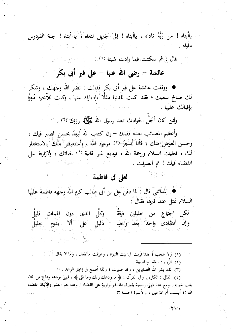 يَا أبتاه من ربه ناداه يَا أبتاه إِلَى جِبْرِيل ننعاه يَا أبتاه جنَّة الفردوس مَأْوَاه قَالَ ثمَّ سكتت فَمَا زَادَت شَيْئا عَائِشَة رضى الله عَنْهَا على قبر أَبى بكر ووقفت عَائِشَة على قبر أَبى بكر فَقَالَت نضر الله وَجهك وشكر لَك صَالح سعيك فقد كنت للدنيا مذلا بإدبارك عَنْهَا وَكنت للآخرة معزا بإقبالك عَلَيْهَا وَلَئِن كَانَ أجل الْحَوَادِث بعد رَسُول الله رزؤك وَأعظم المصائب بعده فقدك إِن كتاب الله ليعد بِحسن الصَّبْر فِيك وَحسن الْعِوَض مِنْك فَأَنا أتنجز مَوْعُود الله وأستعيض مِنْك بالإستغفار لَك فَعَلَيْك السَّلَام وَرَحْمَة الله توديع غير قالية لحياتك وَلَا زارية على الْقَضَاء فِيك ثمَّ انصرفت لعلى فى فَاطِمَة المدائنى قَالَ لما دفن على بن أَبى طَالب كرم الله وَجهه فَاطِمَة عَلَيْهَا السَّلَام تمثل عِنْد قبرها فَقَالَ لكل اجْتِمَاع من خليلين فرقة وكل الذى دون الْمَمَات قَلِيل وَإِن افتقادى وَاحِد بعد وَاحِد دَلِيل على أَلا يَدُوم خَلِيل