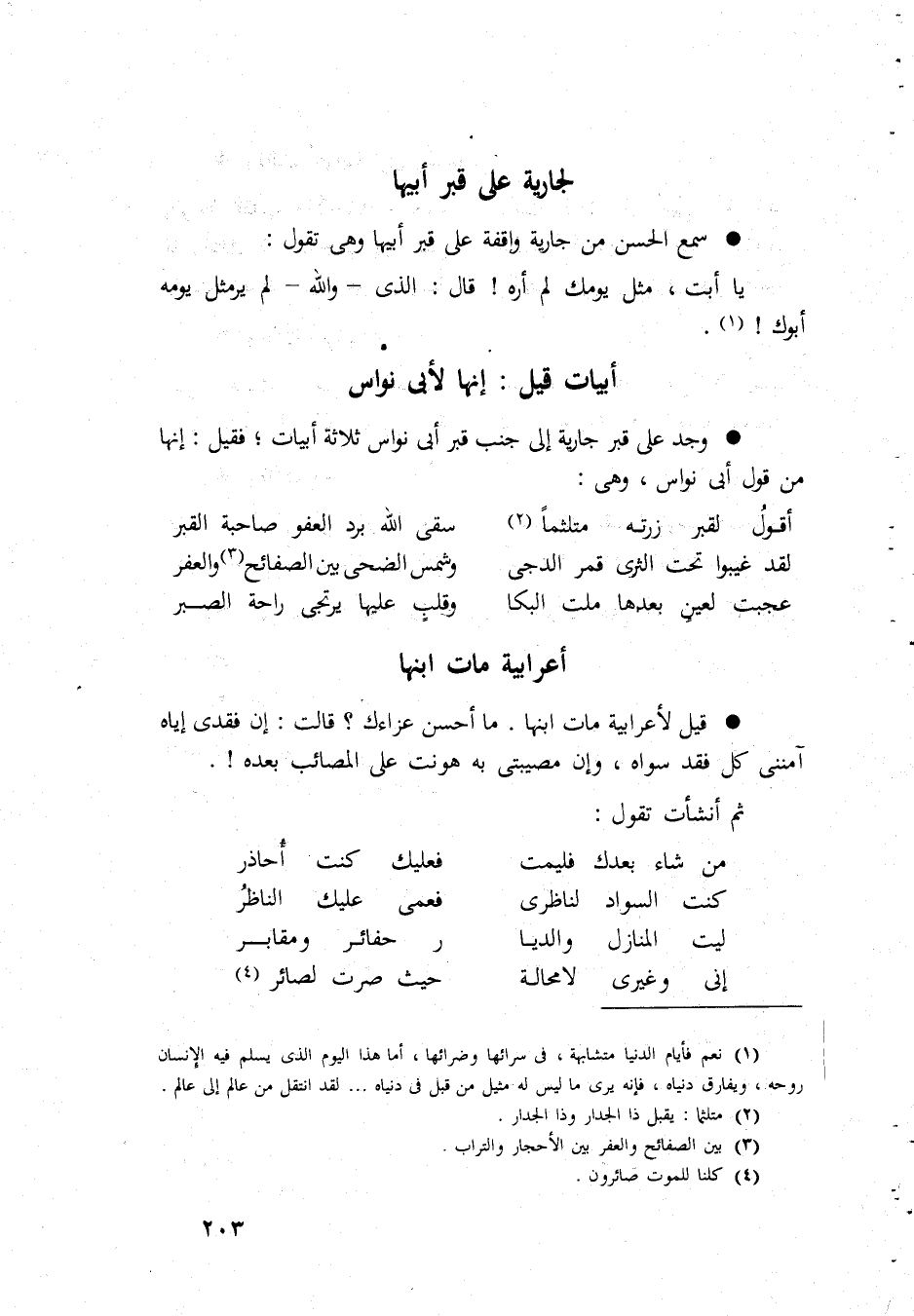 لجارية على قبر أَبِيهَا سمع الْحسن من جَارِيَة واقفة على قبر أَبِيهَا وهى تَقول يَا أَبَت مثل يَوْمك لم أره قَالَ الَّذِي وَالله لم يرمثل يَوْمه أَبوك أَبْيَات قيل إِنَّهَا لأبى نواس وجد على قبر جَارِيَة إِلَى قبر أَبى نواس ثَلَاثَة أَبْيَات فَقيل إِنَّهَا من قَول أَبى نواس وهى أَقُول لقبر زرته متلثما سقى الله برد الْعَفو صَاحِبَة الْقَبْر لقد غَيَّبُوا تَحت الثرى قمر الدجى وشمس الضُّحَى بَين الصفائح والعفر عجبت لعين بعْدهَا ملت البكا وقلب عَلَيْهَا يرتجى رَاحَة الصَّبْر أعرابية مَاتَ ابْنهَا قيل لأعرابية مَاتَ ابْنهَا مَا أحسن عزاءك قَالَت إِن فقدى إِيَّاه آمننى كل فقد سواهُ وَإِن مصيبتى بِهِ هونت على المصائب بعده ثمَّ أنشأت تَقول من شَاءَ بعْدك فليمت فَعَلَيْك كنت أحاذر كنت السوَاد لناظرى فَعمى عَلَيْك النَّاظر لَيْت الْمنَازل الديا ر حفائر ومقابر إنى وغيرى لَا محَالة حَيْثُ صرت لصائر