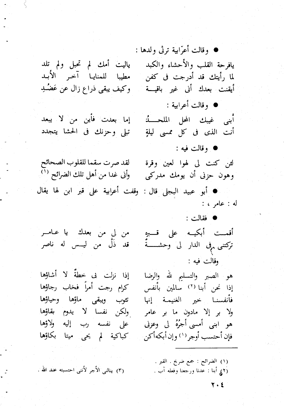 وَقَالَت أعرابية ترثى وَلَدهَا يَا فرحة الْقلب والأحشاء والكبد يَا لَيْت أمك لم تحبل وَلم تَلد لما رَأَيْتُك قد أدرجت فى كفن مطيبا للمنايا آخر الْأَبَد أيقنت بعْدك أَنى غير بَاقِيَة وَكَيف يبْقى ذِرَاع زَالَ عَن عضد وَقَالَت أعرابية أبنى غيبك الْمحل الملحد إِمَّا بَعدت فَأَيْنَ من لَا يبعد أَنْت الذى فى كل ممسى لَيْلَة تبلى وحزنك فى الحشا يَتَجَدَّد وَقَالَت فِيهِ لَئِن كنت لى لهوا لعين وقرة لقد صرت سقما للقلوب الصحائح وَهن حزنى يَوْمك مدركى وأنى غَدا من أهل تِلْكَ الضرائح أَبُو عبيد البجلى قَالَ وقفت أعرابية على قبر ابْن لَهَا يُقَال لَهُ عَامر فَقَالَت أَقمت أبكيه على قَبره من لى من بعْدك يَا عَامر تركتنى فى الدَّار لى وَحْشَة قد ذل من لَيْسَ لَهُ نَاصِر وَقَالَت فِيهِ هُوَ الصَّبْر وَالتَّسْلِيم لله وَالرِّضَا إِذا نزلت بى خطة لَا أشاؤها إِذا نَحن أبنا سَالِمين بأنفس كرام رجت أمرا فخاب رجاؤها فأنفسنا خير الْغَنِيمَة إِنَّهَا تئوب وَيبقى مَاؤُهَا وحياؤها وَلَا بر إِلَّا مادون مَا بر عَامر وَلَكِن نفسا لَا يَدُوم بَقَاؤُهَا هُوَ ابنى أَمْسَى أجره لى وعزنى على نَفسه رب إِلَيْهِ ولاؤها فَإِن أحتسب أوجر وَإِن ابكه أكن كباكية لم يحى مَيتا بكاؤها