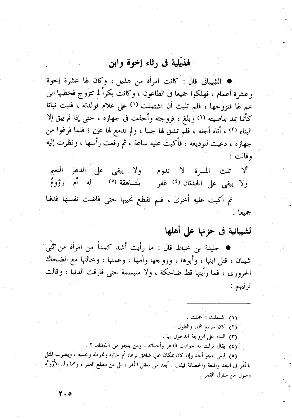 لهذلية فى رثاء إخْوَة وَابْن الشيبانى قَالَ كَانَت امْرَأَة من هُذَيْل وَكَانَ لَهَا عشرَة إخْوَة وَعشرَة أعمام فهلكوا جَمِيعًا فى الطَّاعُون وَكَانَت بكرا لم تتَزَوَّج فَخَطَبَهَا ابْن عَم لَهَا فَتَزَوجهَا فَلم تلبث أَن اشْتَمَلت على غُلَام فولدته فنبت نباتا كَأَنَّمَا يمد بناصيته وَبلغ فزوجته وَأخذت فى جهازه حَتَّى إِذا لم يبْق إِلَّا الْبناء أَتَاهُ أَجله فَلم تشق لَهَا جيبا وَلم تَدْمَع لَهَا عين فَلَمَّا فرغوا من جهازه دعيت لتوديعه فأكبت عَلَيْهِ سَاعَة ثمَّ رفعت رَأسهَا وَنظرت إِلَيْهِ وَقَالَت أَلا تِلْكَ المسرة لَا تدوم وَلَا يبْقى على الدَّهْر النَّعيم وَلَا يبْقى على الْحدثَان غفر بشاهقة لَهُ أم رؤوم ثمَّ أكبت عَلَيْهِ أُخْرَى فَلم تقطع نحيبها حَتَّى فاضت نَفسهَا فدفنا جَمِيعًا لشيبانية فى حزنها على أَهلهَا خَليفَة بن خياط قَالَ مَا رَأَيْت أَشد كمدا من امْرَأَة من بنى شَيبَان قتل ابْنهَا وأبوها وَزوجهَا وَأمّهَا وعمتها وخالتها مَعَ الضَّحَّاك الحرورى فَمَا رَأَيْتهَا قطّ ضاحكة وَلَا متبسمة حَتَّى فَارَقت الدُّنْيَا وَقَالَت ترثيهم