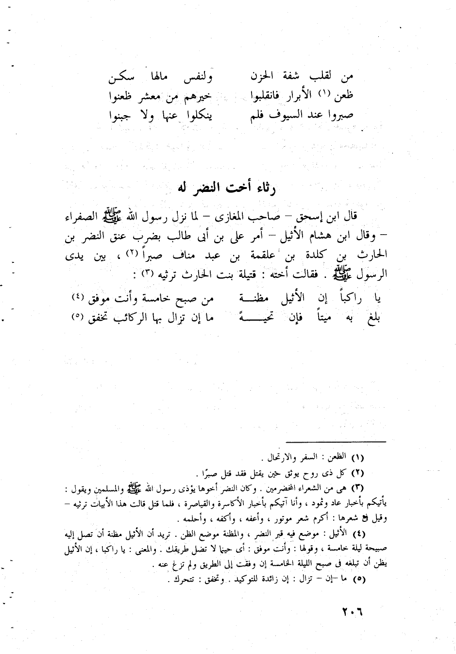 من لقلب شفة الْحزن ولنفس مَالهَا سكن ظعن الْأَبْرَار فانقلبوا خَيرهمْ من معشر ظعنوا صَبَرُوا عِنْد السيوف فَلم ينكلُوا عَنْهَا وَلَا جبنوا رثاء أُخْت النَّضر لَهُ قَالَ ابْن إِسْحَق صَاحب المغازى لما نزل رَسُول الله الصَّفْرَاء وَقَالَ ابْن هِشَام الأثيل أَمر على بن أَبى طَالب بِضَرْب عنق النَّضر بن الْحَارِث بن كلدة بن عَلْقَمَة بن عبد منَاف صبرا بَين يدى الرَّسُول فَقلت أُخْته قتيلة بنت الْحَارِث ترثيه يَا رَاكِبًا إِن الأثيل مَظَنَّة من صبح خَامِسَة وَأَنت موفق بلغ بِهِ مَيتا فَإِن تَحِيَّة مَا إِن تزَال بهَا الركائب تخفق