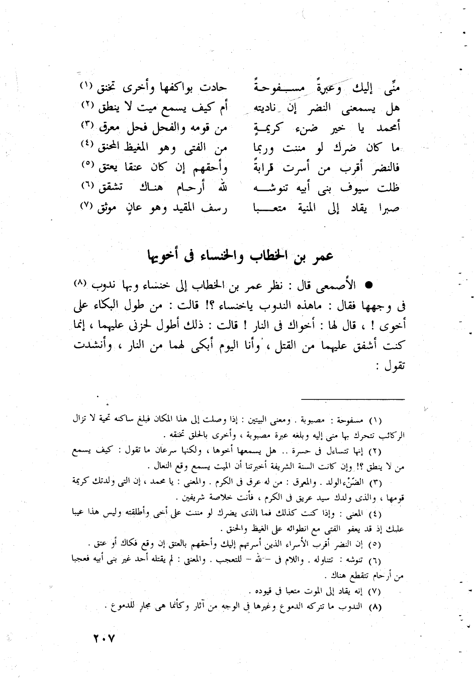 منى إِلَيْك وعبرة مسفوحة حادت بوكفها وَأُخْرَى تخنق هَل يسمعنى النَّضر إِن ناديته أم كَيفَ يسمع ميت لَا ينْطق أمحمد يَا خير ضنء كَرِيمَة من قومه والفحل فَحل معرق مَا كَانَ ضرك لَو مننت وَرُبمَا من الْفَتى وَهُوَ المغيظ المحنق فالنضر أقرب من أسرت قرَابَة وأحقهم إِن كَانَ عنقًا يعْتق ظلت سيوف بنى أَبِيه تنوشه لله أَرْحَام هُنَاكَ تشقق صبرا يُقَاد إِلَى الْمنية متعبا رسف الْمُقَيد هُوَ عان موثق عمر بن الْخطاب والخنساء فى أخويها الأصمعى قَالَ نظر عمر بن الْخطاب إِلَى خنساء وَبهَا نودب فِي وَجههَا فَقَالَ مَا هَذِه الندوب يَا خنساء قَالَت من طول الْبكاء على أخوى قَالَ لَهَا أَخَوَاك فى النَّار قَالَت ذَلِك أطول لحزنى عَلَيْهِمَا إِنَّمَا كنت أشْفق عَلَيْهِمَا من الْقَتْل وَأَنا الْيَوْم أبكى لَهما من النَّار وأنشدت تَقول
