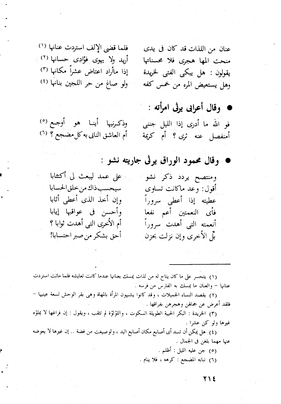 عنان من اللَّذَّات قد كَانَ فى يَدي فَلَمَّا قضى الإلف استردت عنانها منحت المها هجري فَلَا محسناتها أُرِيد وَلَا يهوى فؤادى حسانها يَقُولُونَ هَل يبكى الْفَتى لخريدة إِذا مَا أَرَادَ اعتاض عشرا مَكَانهَا وَهل يستعيض الْمَرْء من خمس كَفه وَلَو صاغ من حر اللجين بنانها وَقَالَ أَعْرَابِي يرثى امْرَأَته فوَاللَّه مَا أدرى إِذا اللَّيْل جننى وذكرنيها أَيّنَا هُوَ أوجع أمنفصل عَنهُ ثرى أم كَرِيمَة أم العاشق النابى بِهِ كل مَضْجَع وَقَالَ مَحْمُود الْوراق يرثى جَارِيَته نشو ومنتصح يردد ذكر نشو على عمد ليَبْعَث لى اكتئابا اقول وعد مَا كَانَت تساوى سيحسب ذَاك من خلق الحسابا عطيته إِذا أعْطى سُرُورًا وَإِن أَخذ الذى اعطى اثابا فأى النعمتين أَعم نفعا وَأحسن فى عواقبها إيابا أنعمته الَّتِى أَهْدَت سُرُورًا أم الْأُخْرَى الَّتِى أَهْدَت ثَوابًا بل الْأُخْرَى وَإِن نزلت بحزن أَحَق بشكر من صَبر احتسابا