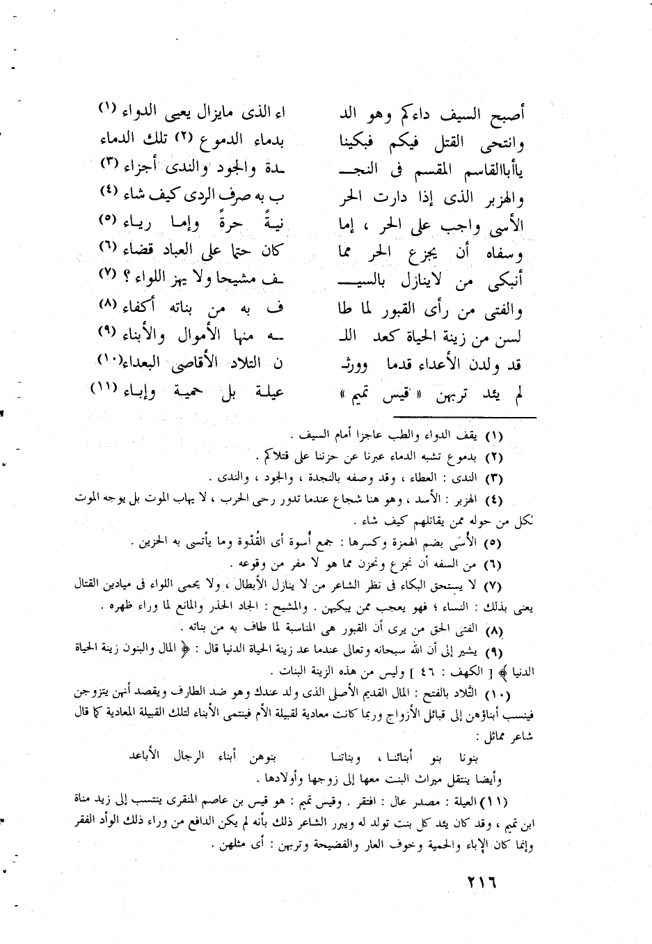 أصبح السَّيْف داءكم وَهُوَ الد اء الذى مَا يزَال يعيى الدَّوَاء وانتحى الْقَتْل فِيكُم فبكينا بدماء الدُّمُوع تِلْكَ الدِّمَاء يَا أَبَا الْقَاسِم الْمقسم فى النجدة والجود والندى أَجزَاء والهزبر الذى إِذا دارت الْحر ب بِهِ صرف الردى كَيفَ شَاءَ الاسى وَاجِب على الْحر إِمَّا نِيَّة حرَّة وَإِمَّا رِيَاء وسفاه أَن يجزع الْحر مِمَّا كَانَ حتما على الْعباد قَضَاء أنبكى من لَا ينازل بِالسَّيْفِ مشيحا وَلَا يهز اللِّوَاء والفتى من رأى الْقُبُور لما طا ف بِهِ من بَنَاته أكفاء لسن من زِينَة الْحَيَاة كعد الله مِنْهَا الْأَمْوَال وَالْأَبْنَاء قد ولدن الْأَعْدَاء قدما وَورث ن التلاد الأقاصى الْبعدَاء لم يئد تربهن قيس تَمِيم عيلة بل حمية وإباء