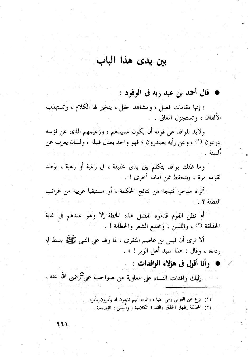قَالَ أَحْمد بن عبد ربه فِي الْوُفُود إِنَّهَا مقامات فضل ومشاهد حفل يتَخَيَّر لَهَا الْكَلَام وتستهذب الْأَلْفَاظ وتستجزل الْمعَانى
