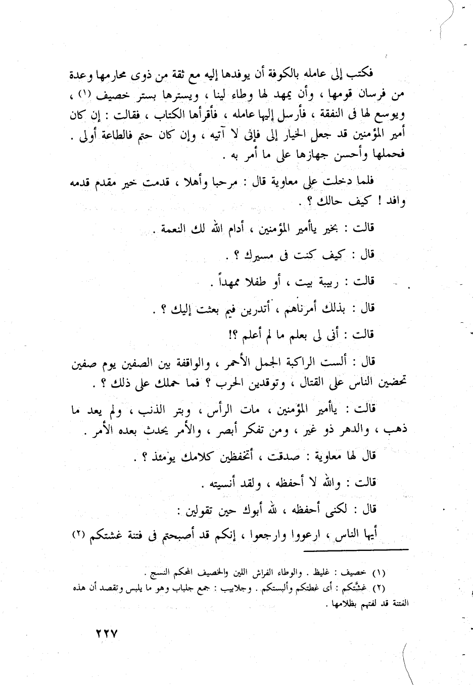 فَكتب إِلَى عَامله بِالْكُوفَةِ أَن يوفدها إِلَيْهِ مَعَ ثِقَة من ذوى محارمها وعدة من فرسَان قَومهَا وَأَن يمهد لَهَا وطاء لينًا ويسترها بستر خصيف ويوسع لَهَا فى النَّفَقَة فَأرْسل إِلَيْهَا عَامله فأقرأها الْكتاب فَقَالَت إِن كَانَ أَمِير الْمُؤمنِينَ قد جعل الْخِيَار إِلَى فإنى لَا آتيه وَإِن كَانَ حتم والشاعة أولى فحملها وَأحسن جهازها على مَا أَمر بِهِ فَلَمَّا دخلت على مُعَاوِيَة قَالَ مرْحَبًا وَأهلا قدمت خير مقدم قدمه وَافد كَيفَ حالك قَالَت بِخَير يَا أَمِير الْمُؤمنِينَ ادام الله لَك النِّعْمَة قَالَ كَيفَ كنت فى مسيرك قَالَت ربيبة بَيت أَو طفْلا ممهدا قَالَ بذلك أمرناهم اتدرين فيمَ بعثت إِلَيْك قَالَت أَنى لى بِعلم مَا لم أعلم قَالَ أَلَسْت الراكبة الْجمل الْأَحْمَر والواقفة بَين الصفين يَوْم صفّين تحضين النَّاس على الْقِتَال وتوقدين الْحَرْب فَمَا حملك على ذَلِك قَالَت يَا أَمِير الْمُؤمنِينَ مَاتَ الرَّأْس وبتر الذَّنب وَلم يعد مَا ذهب والدهر ذُو غير وَمن تفكر أبْصر وَالْأَمر يحدث بعده الْأَمر قَالَ لَهَا مُعَاوِيَة صدقت أتحفظين كلامك يَوْمئِذٍ قَالَت وَالله لَا أحفظه وَلَقَد أنسيته قَالَ لكنى احفظه لله أَبوك حِين تَقُولِينَ أَيهَا النَّاس ارعووا وَارْجِعُوا إِنَّكُم قد اصبحتم فى فتْنَة غشتكم
