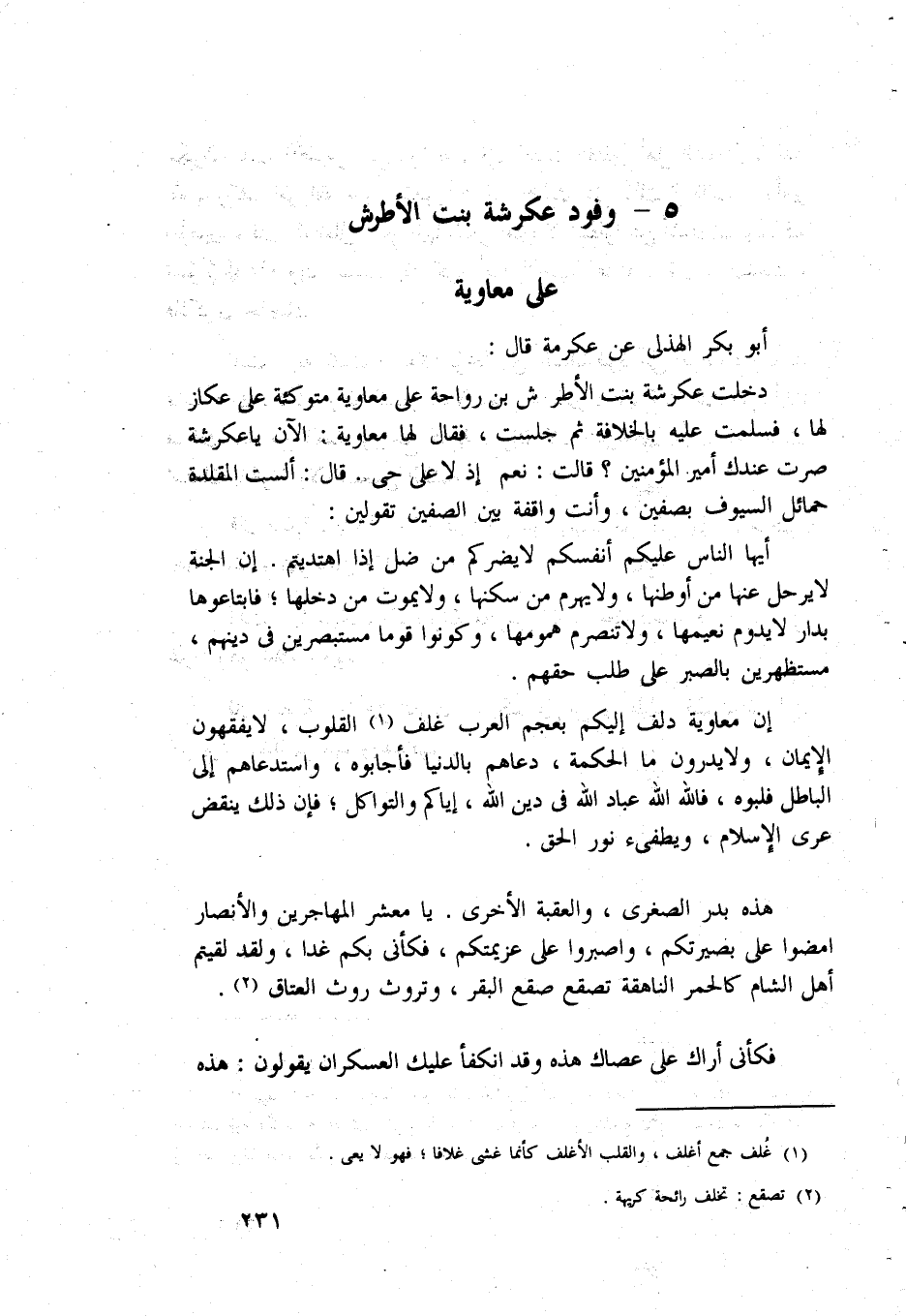 وُفُود عكرشة بنت الأطرش على مُعَاوِيَة أَبُو بكر الهذلى عَن عِكْرِمَة قَالَ دخلت عكرشة بنت الأطرش بن رَوَاحَة على مُعَاوِيَة متوكئة على عكاز لَهَا فَسلمت عَلَيْهِ بالخلافة ثمَّ جَلَست فَقَالَ لَهَا مُعَاوِيَة الْآن يَا عكرشة صرت عنْدك أَمِير الْمُؤمنِينَ قَالَت نعم إِذْ لَا على حى قَالَ أَلَسْت المقلدة حمائل السيوف بصفين وَأَنت واقفة بَين الصفين تَقُولِينَ أَيهَا النَّاس عَلَيْكُم أَنفسكُم لَا يضركم من ضل إِذا اهْتَدَيْتُمْ إِن الْجنَّة لَا يرحل عَنْهَا من أوطنها وَلَا يهرم من سكنها وَلَا يَمُوت من دَخلهَا فابتاعوها بدارا لَا يَدُوم نعيمها وَلَا تنصرم همومها وَكُونُوا قوما مستبصرين فى دينهم مستظهرين بِالصبرِ على طلب حَقهم إِن مُعَاوِيَة دلف إِلَيْكُم بعجم الْعَرَب غلف الْقُلُوب لَا يفقهُونَ الْإِيمَان وَلَا يَدْرُونَ مَا الْحِكْمَة دعاهم بالدنيا فَأَجَابُوهُ واستدعاهم إِلَى الْبَاطِل فلبوه فَالله الله عباد الله فى دين الله إيَّاكُمْ والتواكل فَإِن ذَلِك ينْقض عرى الْإِسْلَام ويطفىء نور الْحق هَذِه بدر الصُّغْرَى والعقبة الاخرى يَا معشر الْمُهَاجِرين وَالْأَنْصَار امضوا على بصيرتكم واصبروا على عزيمتكم فكأنى بكم غَدا وَلَقَد لَقِيتُم أهل الشَّام كالحمر الناهقة تصقع صقع الْبَقر وتورث رَوْث الْعتاق فكأنى أَرَاك على عصاك هَذِه وَقد انكفأ عَلَيْك العسكران يَقُولُونَ هَذِه