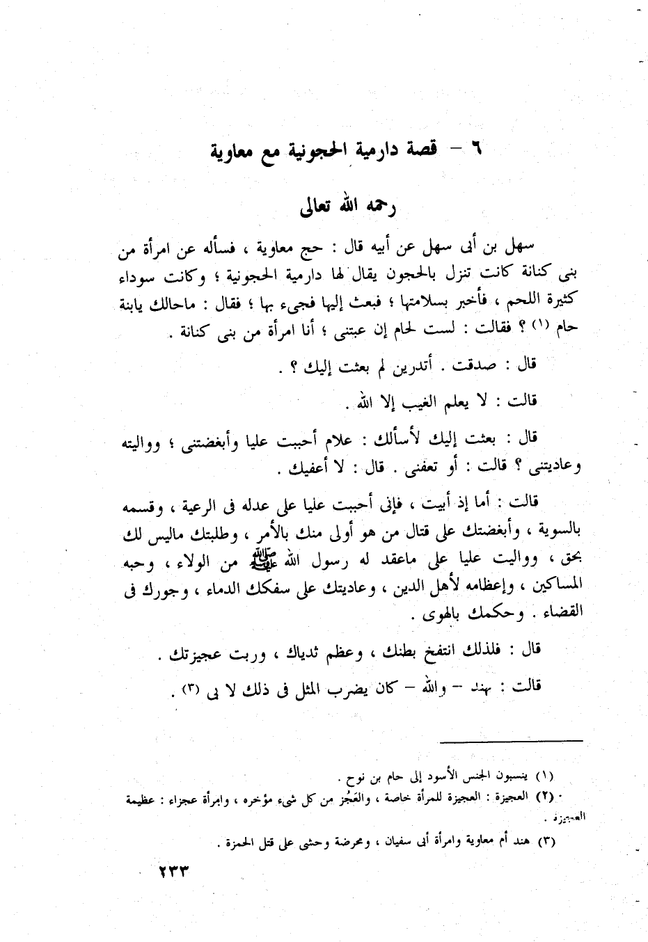 قصَّة دارمية الحجونية مَعَ مُعَاوِيَة رَحمَه الله تَعَالَى سهل بن أَبى سهل عَن أَبِيه قَالَ حج مُعَاوِيَة فَسَأَلَهُ عَن امْرَأَة من بنى كنَانَة كَانَت تنزل بالحجون يُقَال لَهَا دارمية الحجونية وَكَانَت سَوْدَاء كَثِيرَة اللَّحْم فَأخْبر بسلامتها فَبعث إِلَيْهَا فجيء بهَا فَقَالَ مَا حالك يابنة حام فَقَالَت لست لحام إِن عبنتى أَنا امْرَأَة من بنى كنَانَة قَالَ صدقت أَتَدْرِينَ لم بعثت إِلَيْك قَالَت لَا يعلم الْغَيْب إِلَّا الله قَالَ بعثت إِلَيْك لأسألك علام أَحْبَبْت عليا وأبغضتنى وواليته وعاديتنى قَالَت أَو تعفنى قَالَ لَا أعفيك قَالَت أما إِذْ أَبيت فإنى أَحْبَبْت عليا على عدله فى الرّعية وقسمه بِالسَّوِيَّةِ وأبغضبك على قتال من هُوَ أولى مِنْك بِالْأَمر وطلبتك مَا لَيْسَ لَك بِحَق وواليت عليا على مَا عقد لَهُ رَسُول الله من الْوَلَاء وحبه الْمَسَاكِين وإعظامه لأهل الدّين وعاديتك على سفكك الدِّمَاء وجورك فى الْقَضَاء وحكمك بالهى قَالَ فَلذَلِك انتفخ بَطْنك وَعظم ثدياك وربت عجيزتك قَالَت تنهد وَالله كَانَ يضْرب الْمثل فى ذَلِك لَا بى