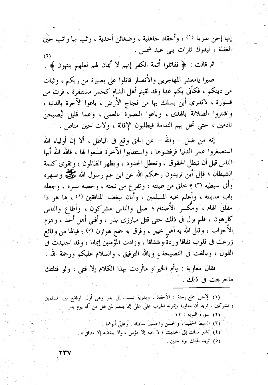 إِنَّهَا إحن بدرية وأحقاد جَاهِلِيَّة وضغائن أحدية وثب بهَا واثب حِين الْغَفْلَة ليدرك ثَارَاتِ بنى عبد شمس ثمَّ قَالَت فَقَاتلُوا أَئِمَّة الْكفْر إِنَّهُم لَا إِيمَان لَهُم لَعَلَّهُم ينتهون صبرا يَا معشر الْمُهَاجِرين وَالْأَنْصَار قَاتلُوا على بَصِيرَة من ربكُم وثبات من دينكُمْ فكأنى بكم غَدا وَقد لَقِيتُم أهل الشَّام كحمر مستنفرة فرت من قسورة لَا تدرى ايْنَ يسْلك بهَا من فجاج الأَرْض باعوا الْآخِرَة بالدنيا واشتروا الضَّلَالَة بِالْهدى وَبَاعُوا البصيرة بالعمى وَعَما قَلِيل ليصبحن نادمين حَتَّى تحل بهم الندامة فيطلبون الْإِقَالَة ولات حِين مناص إِنَّه من ضل وَالله عَن الْحق وَقع فِي الْبَاطِل أَلا إِن أَوْلِيَاء الله استصغروا عمر الدُّنْيَا فرفضوها واستطابوا الْآخِرَة فسعوا لَهَا فَالله الله أَيهَا النَّاس قبل أَن تبطل الْحُقُوق وتعطل الْحُدُود وَيظْهر الظَّالِمُونَ وتقوى كلمة الشَّيْطَان فَإلَى أَيْن تُرِيدُونَ رحمكم الله عَن ابْن عَم رَسُول الله وصهره وأبى سبطية خلق من طينته وتفرع من نبعته وَخَصه بسره وَجعله بَاب مدينته وَأعلم بحبه الْمُسلمين وَأَبَان ببغضه الْمُنَافِقين هَا هُوَ ذَا مفلق الْهَام ومكسر الْأَصْنَام صلى وَالنَّاس مشركون وأطاع وَالنَّاس كَارِهُون فَلم يزل فى ذَلِك حَتَّى قتل مبارزى بدر وأفنى أهل أحد وَهزمَ الْأَحْزَاب وَقتل الله بِهِ أهل خَيْبَر وَفرق بِهِ جمع هوَازن فيا لَهَا من وقائع زرعت فى قُلُوب نفَاقًا وردة وشقاقا وزادت الْمُؤمنِينَ إِيمَانًا وَقد اجتهدت فى القَوْل وبالغت فى النَّصِيحَة وَبِاللَّهِ التَّوْفِيق وَالسَّلَام عَلَيْكُم وَرَحْمَة الله فَقَالَ مُعَاوِيَة يَا أم الْخَيْر مَا أردْت بِهَذَا الْكَلَام إِلَّا قَتْلَى وَلَو قتلتك مَا حرجت فى ذَلِك