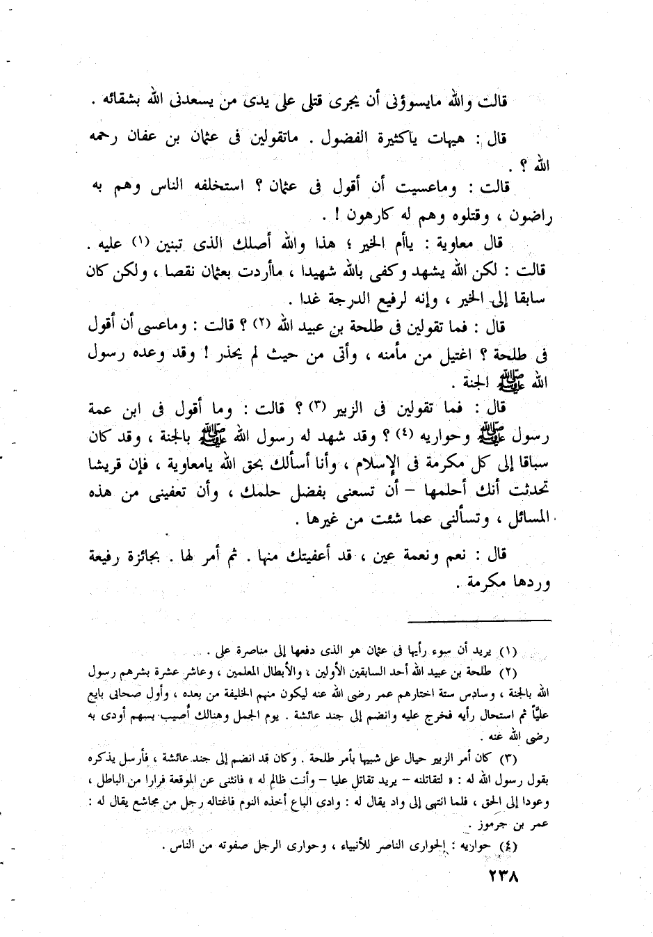 قَالَت وَالله مَا يسوؤنى أَن يجرى قَتْلَى على يدى من يسعدنى الله بشقائه قَالَ هَيْهَات يَا كَثِيرَة الفضول مَا تَقُولِينَ فى عُثْمَان ين عَفَّان رَحمَه الله قَالَت وَمَا عَسَيْت أَن أَقُول فى عُثْمَان اسْتَخْلَفَهُ النَّاس وهم بِهِ راضون وقتلوه وهم لَهُ كَارِهُون قَالَ مُعَاوِيَة يَا أم الْخَيْر هَذَا وَالله أصلك الذى تبنين عَلَيْهِ قَالَت لَكِن الله يشْهد وَكفى بِاللَّه شَهِيدا مَا أردْت بعثمان نقصا وَلَكِن كَانَ سَابِقًا إِلَى الْخَيْر وَإنَّهُ لرفيع الدرجَة غَدا قَالَ فَمَا تَقُولِينَ فى طَلْحَة بن عبيد الله قَالَت وَمَا عَسى أَن أَقُول فى طَلْحَة اغتيل من مأمنه وأتى من حَيْثُ لم يحذر وَقد وعده رَسُول الله الْجنَّة قَالَ فَمَا تَقُولِينَ فى الزبير قَالَت وَمَا أَقُول فى ابْن عمَّة رَسُول الله وحواريه وَقد شهد لَهُ رَسُول الله بِالْجنَّةِ وَقد كَانَ سباقا إِلَى كل مكرمَة فى الْإِسْلَام وَأَنا أَسأَلك بِحَق الله يَا مُعَاوِيَة فَإِن قُريْشًا تحدثت أَنَّك أحلمها أَن تسعنى بِفضل حلمك وَأَن تعفينى من هَذِه الْمسَائِل عَمَّا شِئْت من غَيرهَا قَالَ نعم ونعمة عين قد أعفيتك مِنْهَا ثمَّ أَمر لَهَا بجائزة رفيعة وردهَا مكرمَة