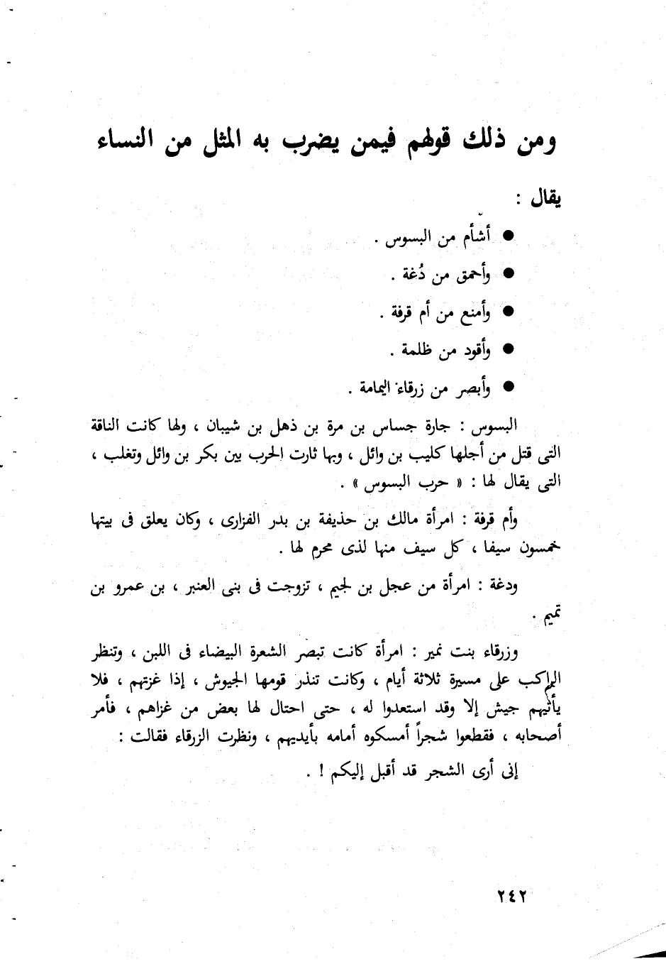 وَمن ذَلِك قَوْلهم يضْرب بِهِ الْمثل من النِّسَاء يُقَال أشأم من البسوس وأحمق من دغة وَأَمْنَع من أم قرفة وأقود من ظلمَة وَأبْصر من زرقاء الْيَمَامَة البسوس جَارة جساس بن مرّة بن ذهل بن شَيبَان وَلها كَانَت النَّاقة الَّتِى قتل من أجلهَا كُلَيْب بن وَائِل وَبهَا ثارت الْحَرْب بَين بكر بن وَائِل وتغلب الَّتِى يُقَال لَهَا حَرْب البسوس وَأم قرفة امْرَأَة مَالك بن حُذَيْفَة بن بدر الفزارى وَكَانَ يغلق فى بَيتهَا خَمْسُونَ سَيْفا كل سيف مِنْهَا لذى محرم لَهَا ودغة امْرَأَة من عجل بن لجيم تزوجت فى بنى العنبر بن عَمْرو بن تَمِيم وزرقاء بنت نمير امْرَأَة كَانَت تبصر الشعرة الْبَيْضَاء فى اللَّبن وَتنظر الرَّاكِب على مسيرَة ثَلَاثَة أَيَّام وَكَانَت تنذر قَومهَا الجيوش إِذا غزتهم فَلَا يَأْتِيهم جَيش إِلَّا وَقد اسْتَعدوا لَهُ حَتَّى احتال لَهَا بعض من غزاهم فَأمر اصحابه فَقطعُوا شَجرا أمسكوه أَمَامه بِأَيْدِيهِم وَنظرت الزَّرْقَاء فَقَالَت إنى أرى الشّجر قد أقبل إِلَيْكُم