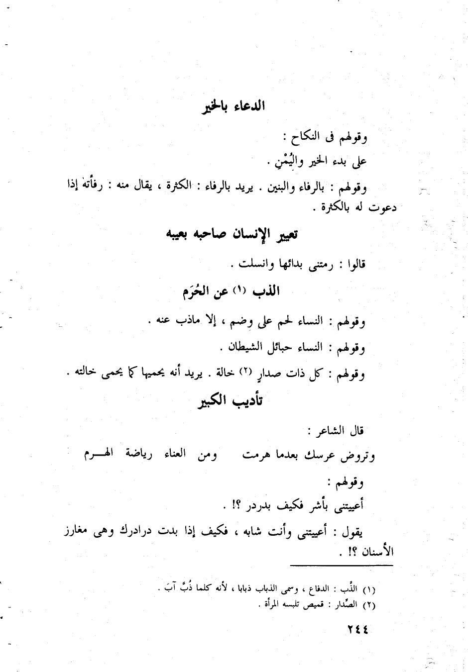 الدُّعَاء بِالْخَيرِ وَقَوْلهمْ فى النِّكَاح على بَدْء الْخَيْر واليمن وَقَوْلهمْ بالرفاء والبنين يُرِيد بالرفاء الْكَثْرَة يُقَال مِنْهُ رفأته إِذا دَعَوْت لَهُ بِالْكَثْرَةِ تعيير الْإِنْسَان صَاحبه بِعَيْبِهِ قَالُوا رمتنى بدائها وانسلت الذب عَن الْحرم وَقَوْلهمْ النِّسَاء لَهُم على وَضم إِلَّا ذب عَنهُ وَقَوْلهمْ النِّسَاء حبائل الشَّيْطَان وَقَوْلهمْ كل ذَات صدار خَالَة يُرِيد أَنه يحميها كَمَا يحمى خَالَته تَأْدِيب الْكَبِير قَالَ الشَّاعِر وتروض عرسك بَعْدَمَا هرمت وم العناء رياضة الْهَرم وَقَوْلهمْ أعييتنى بأشر فَكيف بدردر يَقُول أعييتنى وأ شابه فَكيف إِذا بَدَت درادرك وهى مغرز الْأَسْنَان