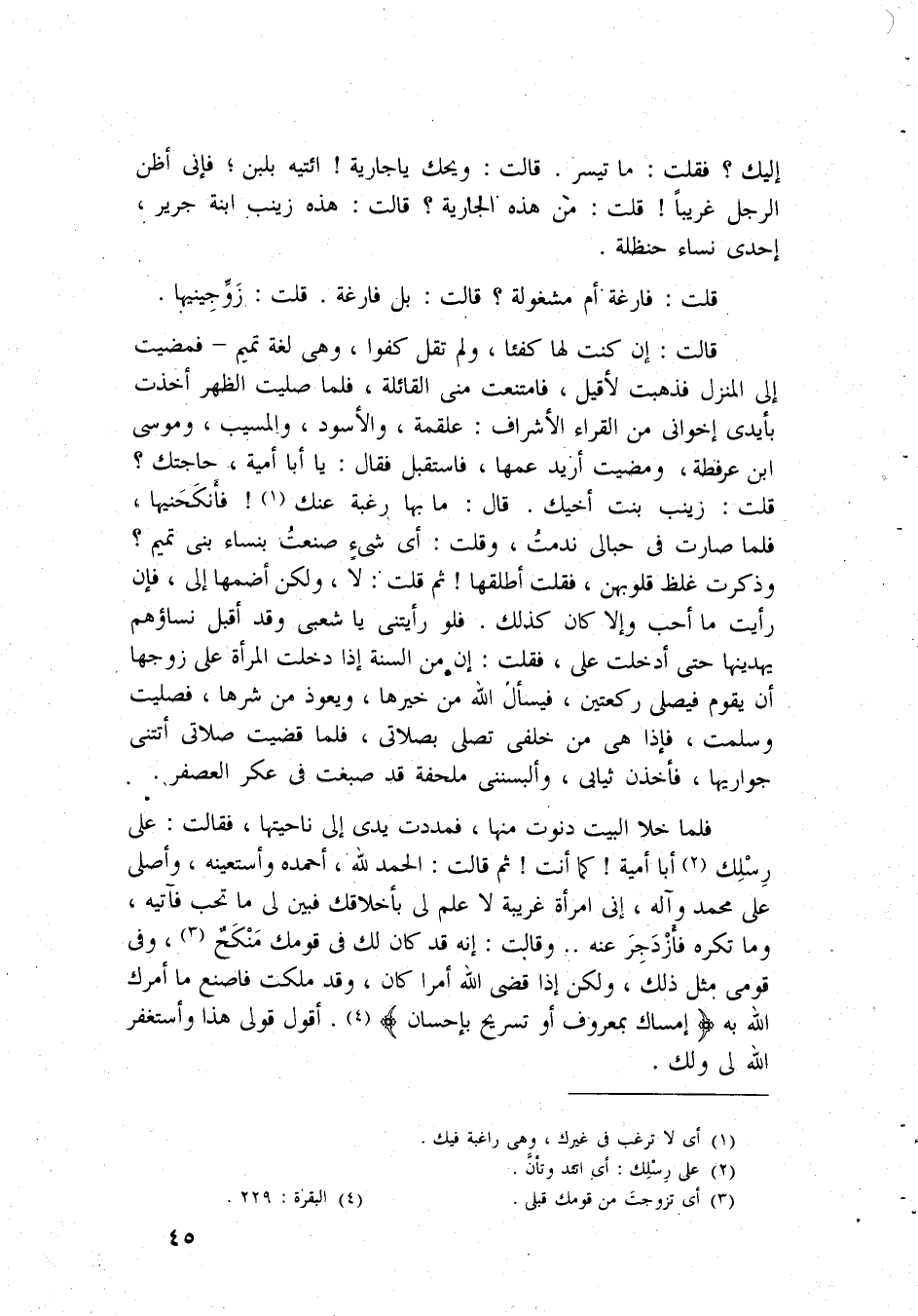إِلَيْك فَقلت قَالَت وَيحك يَا جَارِيَة مَا تيَسّر قَالَت وَيحك يَا جَارِيَة ائتيه بِلَبن فَإِنِّي أَظن الرجل غَرِيبا قلت من هَذِه الْجَارِيَة قَالَت هَذِه زَيْنَب ابْنة جرير إِحْدَى نسَاء حَنْظَلَة قلت فارغة أم مَشْغُولَة قَالَت بل فارغة قلت زوجينيها قَالَت إِن كنت لَهَا كفئا وَلم تقل لَهُ كفوا وهى لُغَة تَمِيم فمضيت إِلَى الْمنزل فَذَهَبت لأقيل فامتنعت مني القائلة فَلَمَّا صليت الظّهْر أخذت بأيدي إخْوَانِي من الْقُرَّاء الْأَشْرَاف عَلْقَمَة وَالْأسود وَالْمُسَيب ومُوسَى ابْن عرفطة ومضيت أُرِيد عَمها فَاسْتقْبل فَقَالَ يَا أَبَا أُميَّة حَاجَتك قلت زَيْنَب بنت أَخِيك قَالَ مَا بهَا رَغْبَة عَنْك فأنكحنيها فَلَمَّا صَارَت فِي حبالى نَدِمت نَدِمت وَقلت أى شَيْء صنعت بنساء بني تَمِيم وَذكرت غلظ قلوبهن فَقلت أطلقها ثمَّ قلت لَا وَلَكِن أضمها إِلَى فَإِن رَأَيْت مَا أحب وَإِلَّا كَانَ كَذَلِك فَلَو رَأَيْتنِي يَا شعبي وَقد أقبل نِسَاؤُهُم يهدينها حَتَّى أدخلت على فَقلت إِن من السّنة إِذا دخلت الْمَرْأَة على زَوجهَا أَن يقوم فيصلى رَكْعَتَيْنِ فَيسْأَل الله من خَيرهَا ويعوذ من شَرها فَصليت وسلمت فَإِذا هى من خَلْفي تصلي بصلاتي فَلَمَّا قضيت صَلَاتي أَتَتْنِي جواريها فأخذن ثِيَابِي وألبسنني ملحفة قد صبغت فِي عكر العصفر فَلَمَّا خلا الْبَيْت دَنَوْت مِنْهَا فمددت يَدي إِلَى ناحيتها فَقَالَت على رسلك أَبَا أُميَّة كَمَا أَنْت ثمَّ قَالَت الْحَمد لله أَحْمَده وَأَسْتَعِينهُ وأصلى على مُحَمَّد وَآله إِنِّي امْرَأَة غَرِيبَة لَا علم لي بأخلاقك فَبين لى مَا تحب فآتيه وَمَا تكره فأزدجر عَنهُ وَقَالَت إِنَّه قد كَانَ لَك فِي قَوْمك منكح وَفِي قومِي مثل ذَلِك وَلَكِن إِذا قضى الله أمرا كَانَ وَقد ملكت فَاصْنَعْ مَا أَمرك الله لَهُ إمْسَاك بِمَعْرُوف أَو بتسريح بِإِحْسَان أَقُول قولي هَذَا وَأَسْتَغْفِر الله لى وَلَك