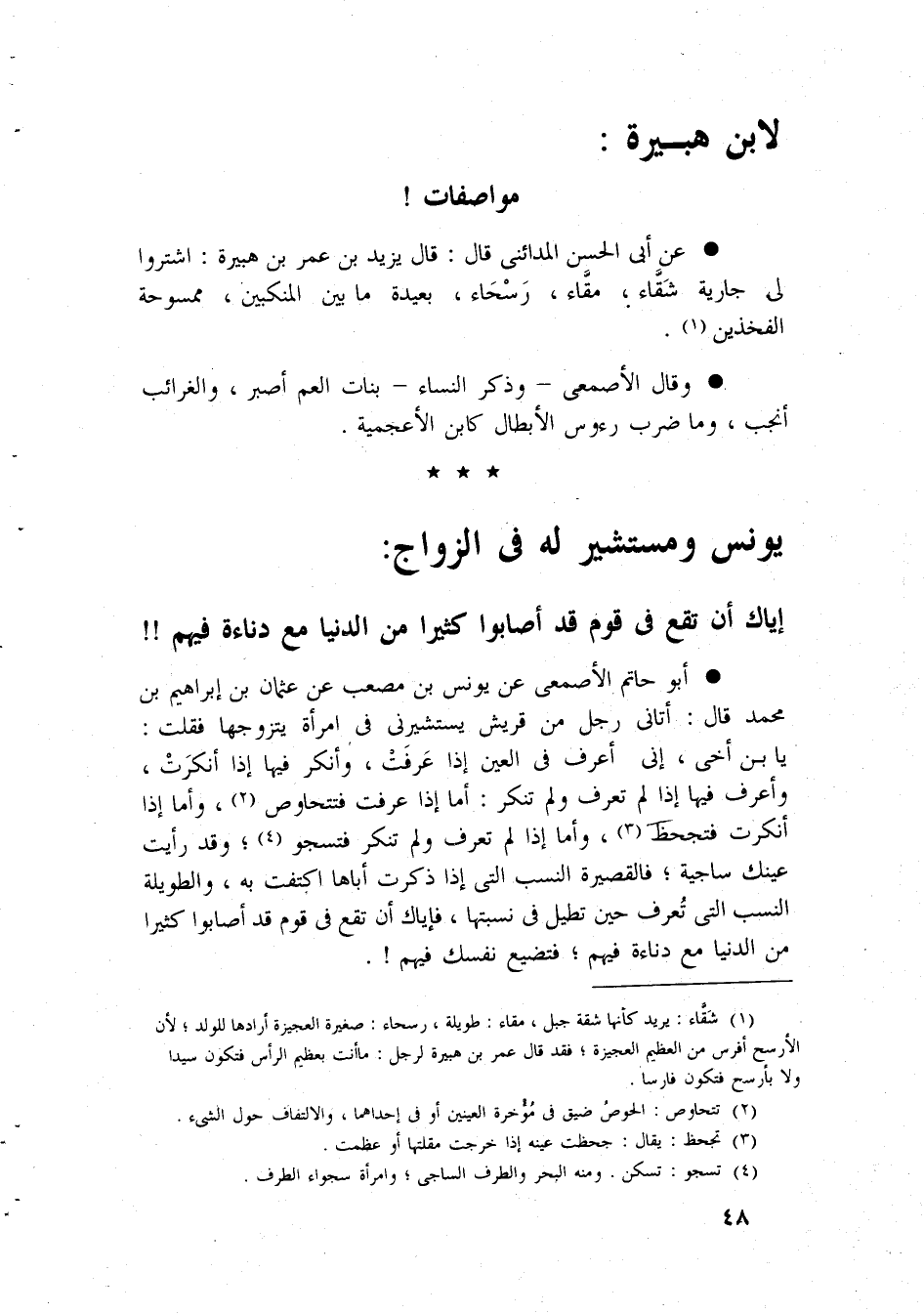 لِابْنِ هُبَيْرَة مواصفات عَن أبي الْحسن الْمَدَائِنِي قَالَ قَالَ يزِيد بن عمر بن هُبَيْرَة اشْتَروا لي جَارِيَة شقاء مقاء رسحاء بعيدَة مَا بَين الْمَنْكِبَيْنِ ممسوحة الفخذين وَقَالَ الاصمعي وَذكر النِّسَاء بَنَات الْعم أَصْبِر والغرائب أَنْجَب وَمَا ضرب رُءُوس الْأَبْطَال كَابْن الأعجمية يُونُس ومستشير لَهُ فِي الزواج إياك أَن تقع فِي قوم قد أَصَابُوا كثيرا من الدُّنْيَا مَعَ دناءة فيهم أَبُو حَاتِم الْأَصْمَعِي عَن يُونُس بن مُصعب عَن عُثْمَان بن إِبْرَاهِيم بن مُحَمَّد قَالَ أَتَانِي رجل من قُرَيْش يستشيرني فِي امْرَأَة يَتَزَوَّجهَا فَقلت يَا ابْن أخي إِنِّي أعرف فِي الْعين إِذا عرفت وَأنكر فِيهَا إِذا أنْكرت وَأعرف فِيهَا إِذا لم تعرف وَلم تنكر أما إِذا عرفت فتتحاوص وَأما إِذا أنْكرت فتجحظ وَأما إِذا لم تعرف وَلم تنكر فتسجو وَقد رَأَيْت عَيْنك ساجية فالقصيرة النّسَب الَّتِي إِذا ذكرت أَبَاهَا اكتفت بِهِ والطويلة النّسَب الَّتِي تعرف حِين تطيل فِي نسبتها فإياك أَن تقع فِي قوم قد أَصَابُوا كثيرا من الدُّنْيَا مَعَ دناءة فيهم فتضيع نَفسك فيهم