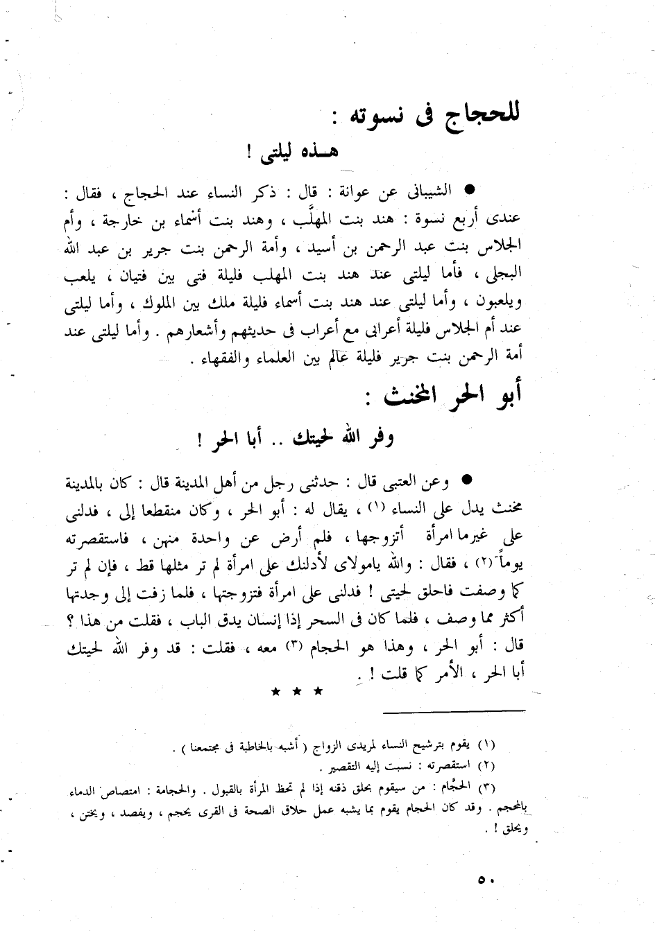 للحجاج فِي نسوته هَذِه لَيْلَتي الشَّيْبَانِيّ عَن عوَانَة قَالَ ذكر النِّسَاء عِنْد الْحجَّاج فَقَالَ عِنْدِي أَربع نسْوَة هِنْد بنت الْمُهلب وَهِنْد بنت أَسمَاء بن خَارِجَة وَأم الْجلاس بنت عبد الرَّحْمَن بن أسيد وَأمة الرَّحْمَن بنت جرير بن عبد الله البَجلِيّ فَأَما لَيْلَتي عِنْد هِنْد بنت الْمُهلب فليلة فَتى بَين فتيَان يلْعَب ويلعبون وَأما لَيْلَتي عِنْد هِنْد بنت أَسمَاء فليلة ملك بَين الْمُلُوك وَأما لَيْلَتي عِنْد أم الْجلاس فليلة أَعْرَابِي مَعَ أَعْرَاب فِي حَدِيثهمْ وأشعارهم وَأما لَيْلَتي عِنْد أمة الرَّحْمَن بنت جرير فليلة عَالم بَين الْعلمَاء وَالْفُقَهَاء أَبُو الْحر المخنث وفر الله لحيتك أَبَا الْحر وَعَن العتبى قَالَ حَدثنِي رجل من أهل الْمَدِينَة قَالَ كَانَ بِالْمَدِينَةِ مخنث يدل على النِّسَاء يُقَال لَهُ أَبُو الْحر وَكَانَ مُنْقَطِعًا إِلَى فدلني على غَيرهَا امْرَأَة أَتَزَوَّجهَا فَلم أَرض عَن وَاحِدَة مِنْهُنَّ فاستقصرته يَوْمًا فَقَالَ وَالله يَا مولَايَ لأدلنك على امْرَأَة لم تَرَ مثلهَا قطّ فَإِن لم تَرَ كَمَا وصفت فَاحْلِقْ لحيتي فدلني على امْرَأَة فتزوجتها فَلَمَّا زفت إِلَى وَجدتهَا أَكثر مِمَّا وصف فَلَمَّا كَانَ فِي السحر إِذا إِنْسَان يدق الْبَاب فَقلت من هَذَا قَالَ أَبُو الْحر وَهَذَا هُوَ الْحجام مَعَه فَقلت قد وفر الله لحيتك أَبَا الْحر الْأَمر كَمَا قلت