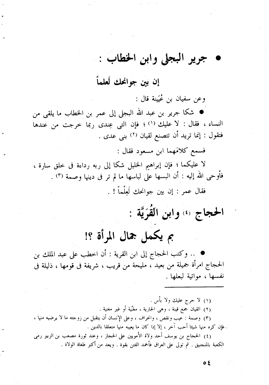 جرير البَجلِيّ وَابْن الْخطاب إِن بَين جوانحك لعلما وَعَن سُفْيَان بن عُيَيْنَة قَالَ شكا جرير بن عبد الله البَجلِيّ إِلَى عمر بن الْخطاب مَا يلقى من النِّسَاء فَقَالَ لَا عَلَيْك فَإِن الَّتِي عِنْدِي رُبمَا خرجت من عِنْدهَا فَتَقول إِنَّمَا تُرِيدُ أَن تتصنع لقيان بني عدي فَسمع كَلَامهمَا ابْن مَسْعُود فَقَالَ لَا عَلَيْكُمَا فَإِن إِبْرَاهِيم الْخَلِيل شكا إِلَى ربه رداءة فِي خلق سارة فَأوحى الله إِلَيْهِ أَن البسها على مالم تَرَ فِي دينهَا وصمة فَقَالَ عمر إِن بَين جوانحك لعلما الْحجَّاج وَابْن الْقرْيَة بِمَ يكمل جمال الْمَرْأَة وَكتب الْحجَّاج إِلَى ابْن الْقرْيَة أَن اخْطُبْ على عبد الْملك بن الْحجَّاج امْرَأَة جميلَة من بعيد مليحة من قريب شريفة فِي قَومهَا ذليلة فِي نَفسهَا مواتية لبعلها