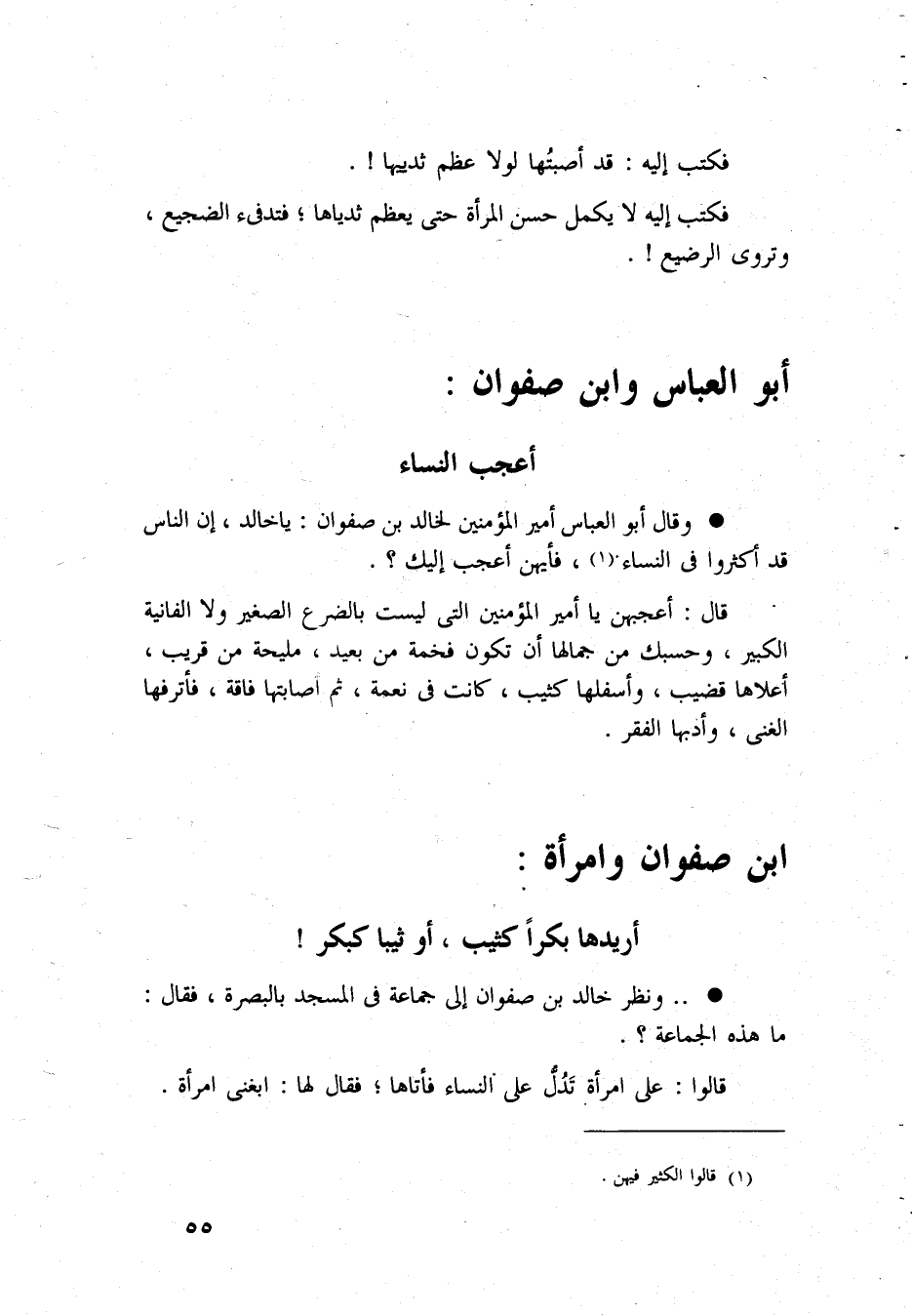 فَكتب إِلَيْهِ قد أصبتها لَوْلَا عظم ثدييها فَكتب إِلَيْهِ لَا يكمل حسن الْمَرْأَة حَتَّى يعظم ثدياها فتدفئ الضجيع وتروى الرَّضِيع أَبُو الْعَبَّاس وَابْن صَفْوَان أعجب النِّسَاء وَقَالَ أَبُو الْعَبَّاس أَمِير الْمُؤمنِينَ لخَالِد بن صَفْوَان يَا خَالِد إِن النَّاس قد أَكْثرُوا فِي النِّسَاء فأيهن أعجب إِلَيْك قَالَ أعجبهن يَا أَمِير الْمُؤمنِينَ الَّتِي لَيست بالضرع الصَّغِير وَلَا الفانية الْكَبِير وحسبك من جمَالهَا أَن تكون فخمة من بعيد مليحة من قريب أَعْلَاهَا قضيب وأسفلها كثيب كَانَت فِي نعْمَة ثمَّ أصابتها فاقة فأترفها الْغنى وأدبها الْفقر ابْن صَفْوَان وَامْرَأَة أريدها بكرا كثيب أَو ثَيِّبًا كبكر وَنظر خَالِد بن صَفْوَان إِلَى جمَاعَة فِي الْمَسْجِد بِالْبَصْرَةِ فَقَالَ مَا هَذِه الْجَمَاعَة قَالُوا على امْرَأَة تدل على النِّسَاء فَأَتَاهَا فَقَالَ لَهَا ابغني امْرَأَة