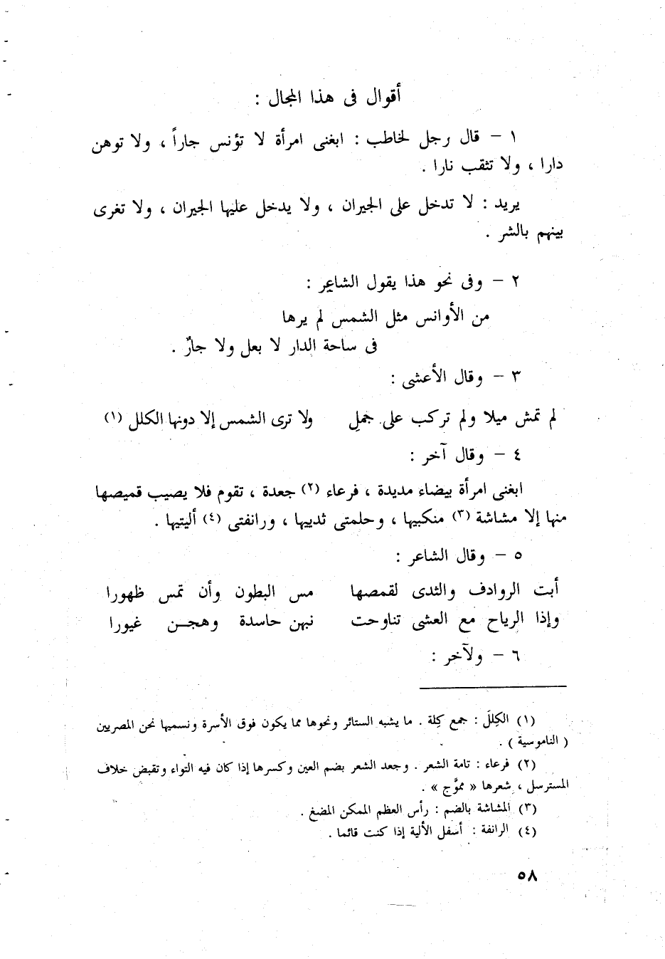 أَقْوَال فِي هَذَا المجال قَالَ رجل لخاطب ابغني امْرَأَة لَا تؤنس جارا وَلَا توهن دَارا وتثقب نَارا يُرِيد لَا تدخل على الْجِيرَان وَلَا يدْخل عَلَيْهَا الْجِيرَان وَلَا تغري بَينهم بِالشَّرِّ وَفِي نَحْو هَذَا يَقُول الشَّاعِر من الأوانس مثل الشَّمْس لم يرهَا فِي ساحة الدَّار لَا بعل وَلَا جَار وَقَالَ الْأَعْشَى لم تمش ميلًا وَلم تركب على جمل وَلَا ترى الشَّمْس إِلَّا دونهَا الكلل وَقَالَ آخر ابغني امْرَأَة بَيْضَاء مديدة فرعاء جعدة تقوم فَلَا يُصِيب قميصها مِنْهَا إِلَّا مشاشة منكبيها وحلمتي ثدييها ورانفتي أليتيها وَقَالَ الشَّاعِر أَبَت الروادف والثدي لقمصها مس الْبُطُون وَأَن تمس ظهورا وَإِذا الرِّيَاح مَعَ الْعشي تناوحت نبهن حاسدة وهجن غيورا وَلآخر