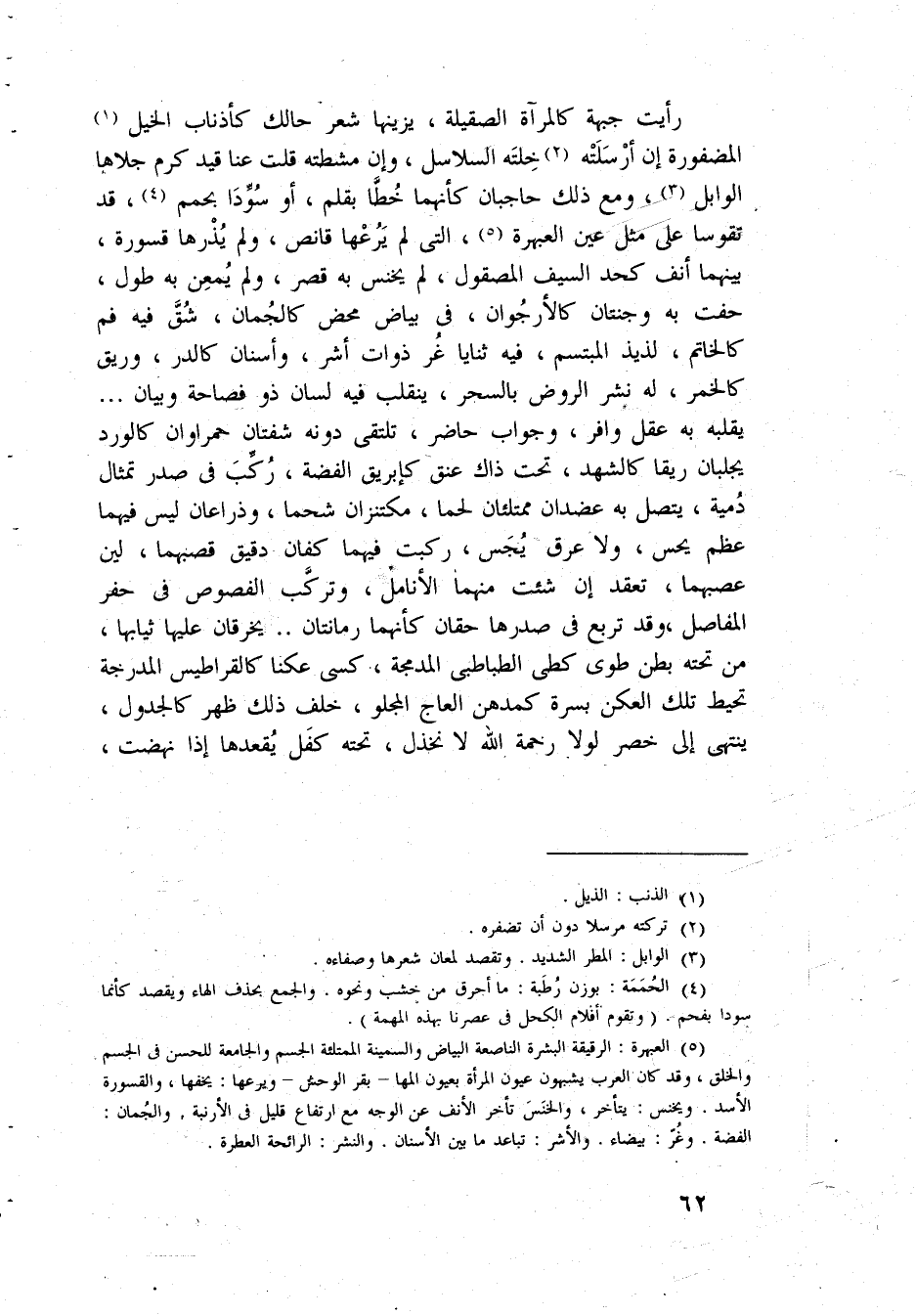 رَأَيْت جبهة كالمرآة الصقيلة يزينها شعر حالك كأذناب الْخَيل المضفورة إِن أَرْسلتهُ خلته السلَاسِل وَإِن مشطته قلت عَنَّا قيد كرم جلاها الوابل وَمَعَ ذَلِك حاجبان كَأَنَّهُمَا خطا بقلم أَو سُودًا بحمم قد تقوسا على مثل عين العبهرة الَّتِي لم يرعها قانص وَلم يذرها قسورة بَينهمَا أنف كَحَد السَّيْف المصقول لم يخنس بِهِ قصر وَلم يمعن بِهِ طول حفت بِهِ وجنتان كالأرجوان فِي بَيَاض مَحْض كالجمان شقّ فِيهِ فَم كالخاتم لذيذ المبتسم فِيهِ ثنايا غر ذَوَات أشر وأسنان كالدر وريق كَالْخمرِ لَهُ نشر الرَّوْض بِالسحرِ يَنْقَلِب فِيهِ لِسَان ذُو فصاحة وَبَيَان يقلبه بِهِ عقل وافر وَجَوَاب حَاضر تلتقي دونه شفتان حمراوان كالورد يجلبان ريقا كالشهد تَحت ذَاك عنق كإبريق الْفضة ركب فِي صدر تِمْثَال دمية يتَّصل بِهِ عضدان ممتلئان لَحْمًا مكتنزان شحما وذراعان لَيْسَ فيهمَا عظم يحس وَلَا عرق يجس ركبت فيهمَا كفان دَقِيق قصبهما لين عصبهما تعقد إِن شِئْت مِنْهُمَا الأنامل وتركب الفصوص فِي حفر المفاصل وَقد تربع فِي صدرها حقان كَأَنَّهُمَا رمانتان يخرقان عَلَيْهَا ثِيَابهَا من تَحْتَهُ بطن طوى كطى الطباطبى المدمجة كسى عكنا كالقراطيس المدرجة تحيط تِلْكَ العكن بسرة كمدهن العاج المجلو خلف ذَلِك ظهر كالجدول يَنْتَهِي إِلَى خصر لَوْلَا رَحْمَة الله لَا نخذل تَحْتَهُ كفل يقعدها إِذا نهضت