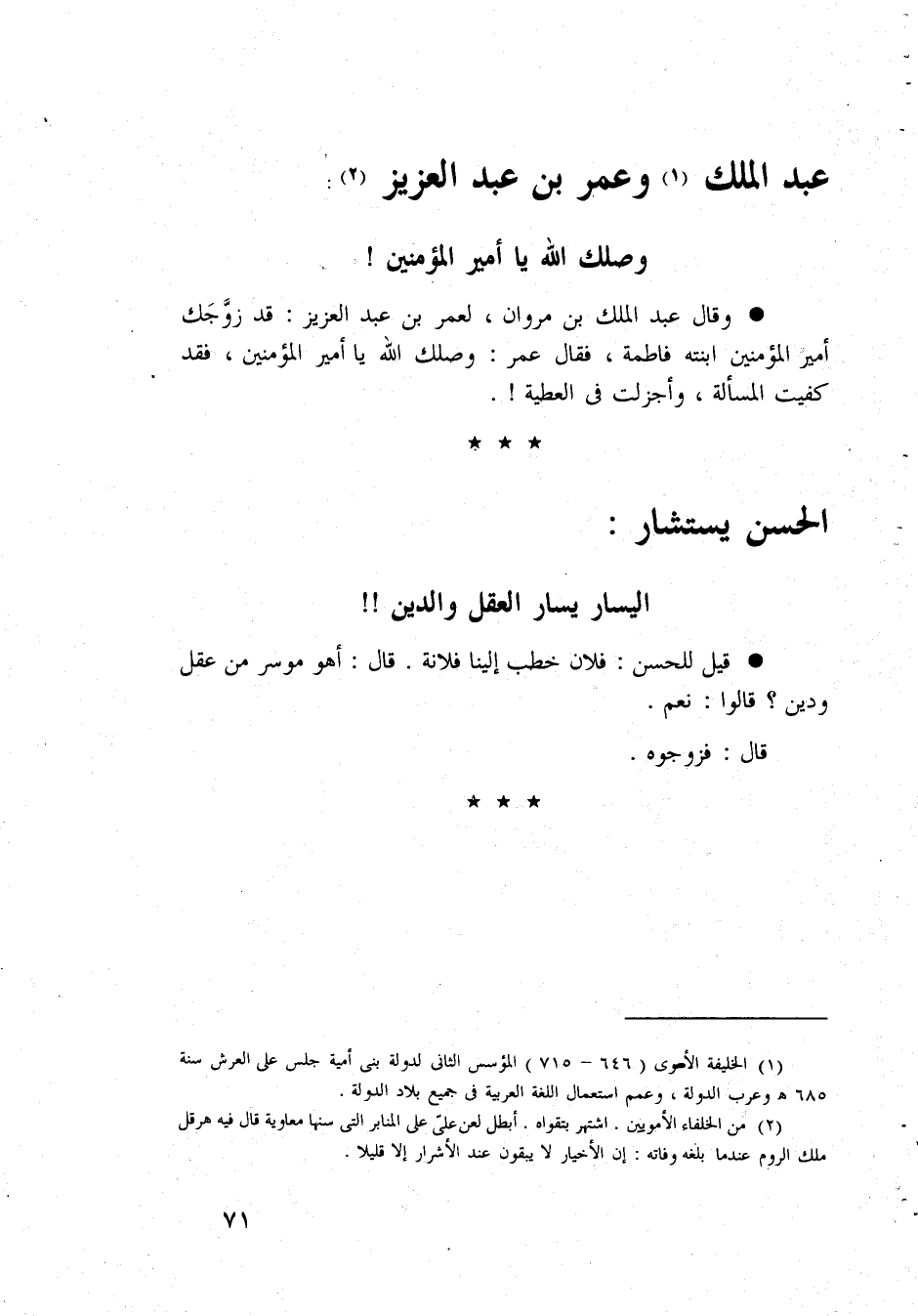 عبد الْملك وَعمر بن عبد الْعَزِيز وصلك الله يَا أَمِير الؤمنين وَقَالَ عبد الْملك بن مَرْوَان لعمر بن عبد الْعَزِيز قد زَوجك أَمِير الْمُؤمنِينَ ابْنَته فَاطِمَة فَقَالَ عمر وصلك الله يَا أَمِير الْمُؤمنِينَ فقد كفيت الْمَسْأَلَة وأجزلت فِي الْعَطِيَّة الْحسن يستشار الْيَسَار يسَار الْعقل وَالدّين قيل لِلْحسنِ فلَان خطب إِلَيْنَا فُلَانَة قَالَ أهوَ مُوسر من عقل وَدين قَالُوا نعم قَالَ فَزَوجُوهُ