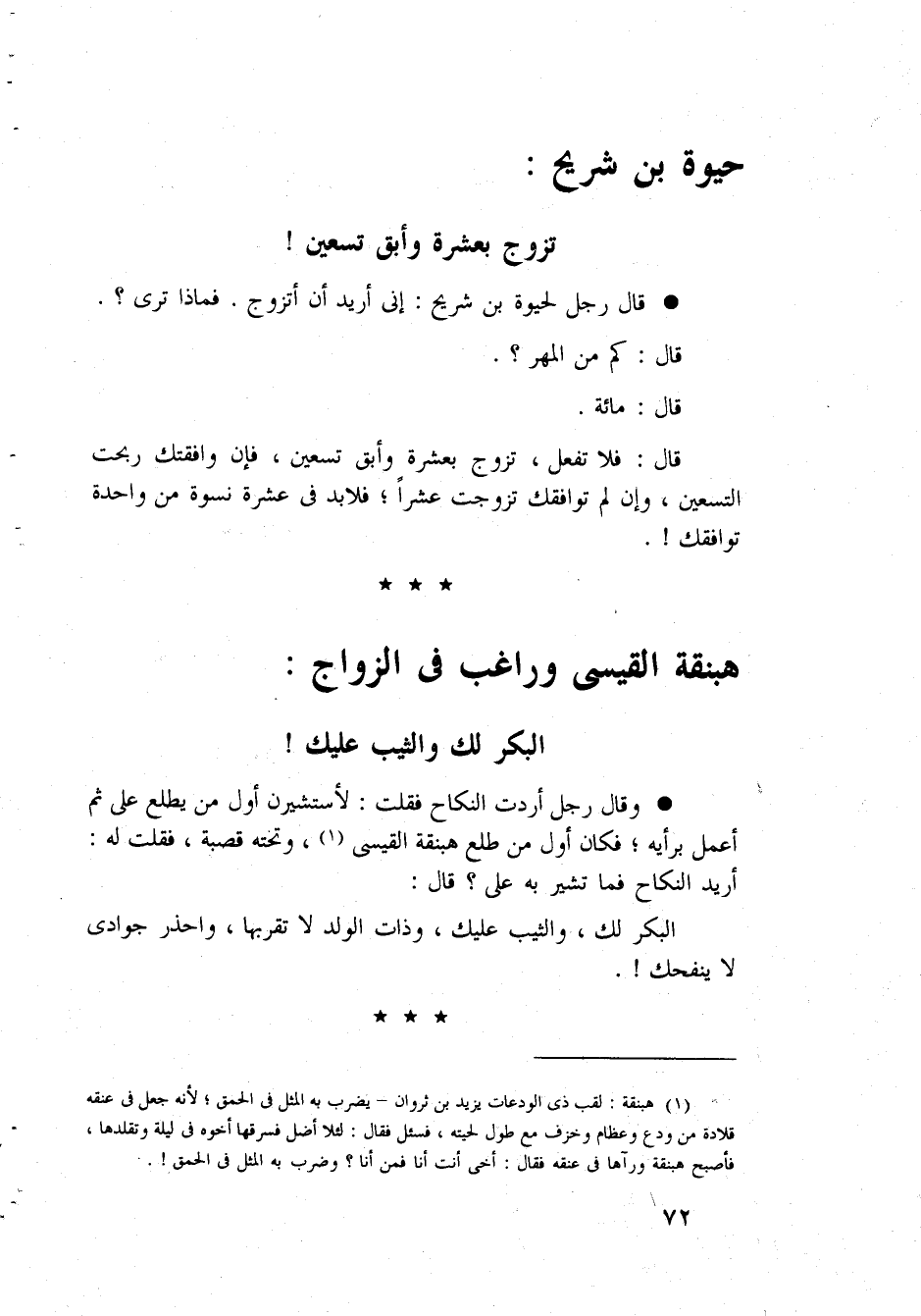 حَيْوَة بن شُرَيْح تزوج بِعشْرَة وأبق تسعين قَالَ رجل لحيوة بن شُرَيْح إنى أُرِيد أَن أَتزوّج فَمَاذَا ترى قَالَ كم من الْمهْر قَالَ مائَة قَالَ فَلَا تفعل تزوج بِعشْرَة وأبق تسعين فَإِن وافقتك ربحت التسعين وَإِن لم توافقك تزوجت عشرا فَلَا بُد فى عشرَة نسْوَة من وَاحِدَة توافقك هبنقة القيسى وراغب فى الزواج الْبكر لَك وَالثَّيِّب عَلَيْك وَقَالَ رجل أردْت النِّكَاح فَقلت لأستشيرن أول من يطلع على ثمَّ أعمل بِرَأْيهِ فَكَانَ أول من طلع هبنقة القيسى وَتَحْته قَصَبَة فَقلت لَهُ أُرِيد النِّكَاح فَمَا تُشِير بِهِ على قَالَ الْبكر لَك وَالثَّيِّب عَلَيْك وَذَات الْوَلَد لَا تَقربهَا وَاحْذَرْ جوادى لَا ينفحك