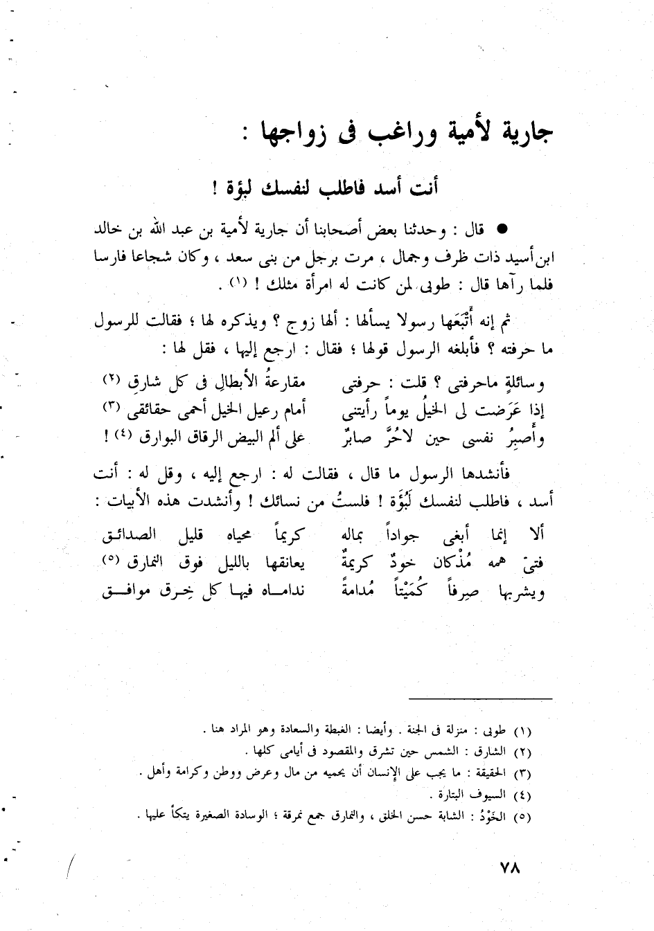 جَارِيَة لأمية وراغب فى زواجها أَنْت أَسد فاطلب لنَفسك لبؤة قَالَ وَحدثنَا بعض أَصْحَابنَا أَن جَارِيَة لأمية بن عبد الله بن خَالِد ابْن أسيد ذَات ظرف وجمال مرت بِرَجُل من بني سعد وَكَانَ شجاعا فَارِسًا فَلَمَّا رَآهَا قَالَ طُوبَى لمن كَانَت لَهُ امْرَأَة مثلك ثمَّ إِنَّه أتبعهَا رَسُولا يسْأَلهَا ألها زوج ويذكره لَهَا فَقَالَت للرسول مَا حرفته فأبلغه الرَّسُول قَوْلهَا فَقَالَ ارْجع إِلَيْهَا فَقل لَهَا وسائلة مَا حرفتى قلت حرفتى مقارعة الْأَبْطَال فى كل شارق إِذا عرضت لى الْخَيل يَوْمًا رأيتنى أَمَام رعيل الْخَيل أحمى حقائقى وأصبر نفسى حِين لاحر صابر على ألم الْبيض الرقَاق البوارق فأنشدها الرَّسُول مَا قَالَ فَقَالَت لَهُ ارْجع إِلَيْهِ وَقل لَهُ أَنْت أَسد فاطلب لنَفسك لبؤة فلست من نِسَائِك وأنشدت هَذِه الأبيات أَلا إِنَّمَا أبغى جوادا بِمَالِه كَرِيمًا محياه قَلِيل الصدائق فَتى همه مذكان خود كَرِيمَة يعانقها بِاللَّيْلِ فَوق النمارق ويشربها صرفا كميتا مدامة نداماه فِيهَا كل خرق مُوَافق