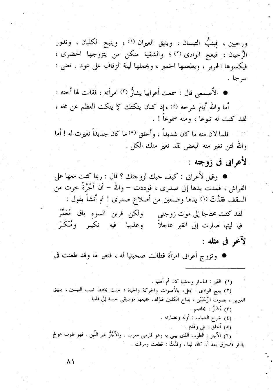 ورحيين فينب التيسان وينهق العيران وينبح الكلبان وتدور الرحيان فيعج الوادى والشقية مِنْكُن من يَتَزَوَّجهَا الْحَضْرَمِيّ فيكسوها الْحَرِير ويطعمها الخمير ويحملها لَيْلَة الزفاف على عود تعنى سرجها الأصمعى قَالَ سَمِعت أَعْرَابِيًا يشار امْرَأَته فَقَالَت لَهَا أُخْته أما وَالله أَيَّام شرخه إِذْ كَانَ ينكتك كَمَا ينكت الْعظم عَن مخه لقد كنت لَهُ تبوعا وَمِنْه مسموعا فَلَمَّا لَان مِنْهُ مَا كَانَ شَدِيدا وأخلق ماكان جَدِيدا تَغَيَّرت لَهُ أما وَالله لَئِن تغير مِنْهُ الْبَعْض لقد تغير مِنْك الْكل لأعرابى فى زَوجته وَقيل لأعرابى كَيفَ حبك لزوجتك قَالَ رُبمَا كنت مَعهَا على الْفراش فمدت يَدهَا إِلَى صدرى فوددت وَالله أَن آجره خرت من السّقف فقدت يَدهَا وضلعين من أضلاع صدرى ثمَّ أنشأ يَقُول لقد كنت مُحْتَاجا إِلَى موت زوجتى وَلَكِن قرين السوء بَاقٍ معمر فيا ليتها صَارَت إِلَى الْقَبْر عَاجلا وعذبها فِيهِ نَكِير ومنكر لآخر فِي مثله وَتزَوج أعرابى امْرَأَة فطالت فى صحبتهَا لَهُ فَتغير لَهَا وَقد طعنت فى