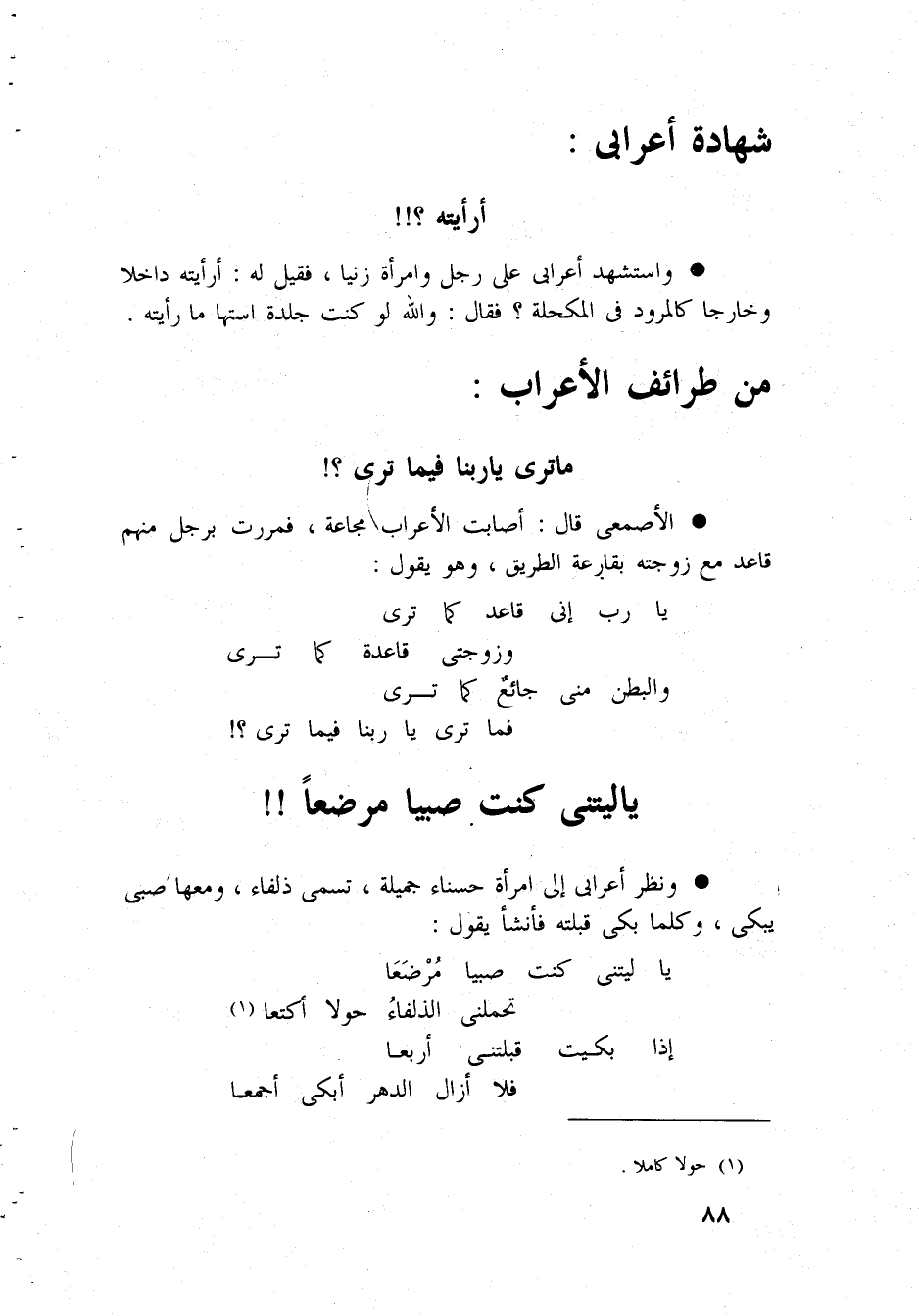 شَهَادَة أعرابى أرأيته وَاسْتشْهدَ أعرابى على رجل وَامْرَأَة زَنَيَا فَقيل لَهُ أرأيته دَاخِلا وخارجا كالمرود فى المكحلة فَقَالَ وَالله لَو كنت جلدَة استها مَا رَأَيْته من طرائف الْأَعْرَاب مَا ترى يَا رَبنَا فِيمَا ترى الأصمعى قَالَ اصابت الْأَعْرَاب مجاعَة فمررت بِرَجُل مِنْهُم قَاعد مَعَ زَوجته بقارعة الطَّرِيق وَهُوَ يَقُول يَا رب إِنِّي قَاعد كَمَا ترى وزوجتي قَاعِدَة كَمَا ترى ترى فَمَا ترى يَا رَبنَا فِيمَا ترى يَا ليتنى كنت صَبيا مُرْضعًا وَنظر أَعْرَابِي إِلَى امْرَأَة حسناء جميلَة تسمى ذلفاء وَمَعَهَا صبى يبكى وَكلما بَكَى قبلته فَأَنْشَأَ يَقُول يَا ليتنى كنت صَبيا مُرْضعًا تحملنى الذلفاء حولا أكتعا إِذا بَكَيْت قبلتنى أَرْبعا فَلَا أَزَال الدَّهْر أبكى أجمعا