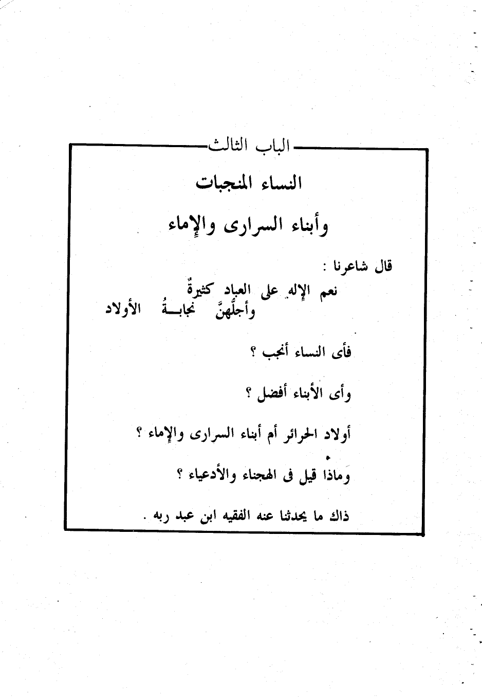 الْبَاب الثَّالِث النِّسَاء المنجبات وَأَبْنَاء السرارى وَالْإِمَاء قَالَ شَاعِرنَا نعم الْإِلَه على الْعباد كَثِيرَة وأجهلهن نجابة الْأَوْلَاد فَأَي النِّسَاء أَنْجَب وَأي الْأَبْنَاء أفضل أَوْلَاد الْحَرَائِر أم أَبنَاء السرارى وَالْإِمَاء وماذا قيل فِي الهجناء والأدعياء ذَاك مَا يحدثنا عَنهُ الْفَقِيه ابْن عبد ربه