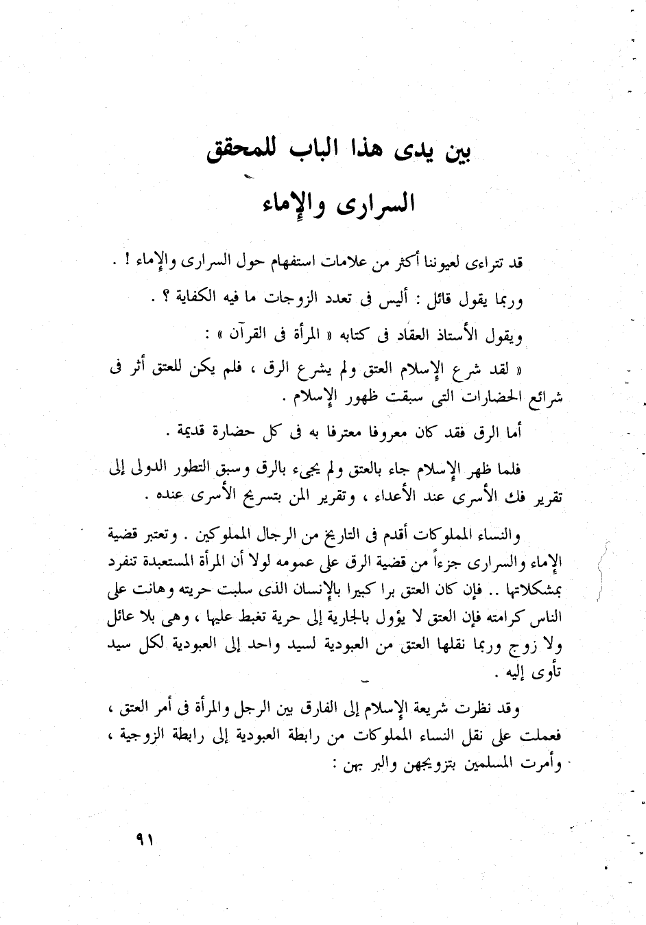وَالنِّسَاء المملوكات أقدم فِي التَّارِيخ من الرِّجَال المملوكين وَتعْتَبر قَضِيَّة الْإِمَاء والسرارى جُزْءا من قَضِيَّة الرّقّ على عُمُومه لَوْلَا أَن الْمَرْأَة المستعبدة تنفرد بمشكلاتها فَإِن كَانَ الْعتْق برا كَبِيرا بالإنسان الَّذِي سلبت حُرِّيَّته وهانت على النَّاس كرامته فَإِن الْعتْق لَا يؤول بالجارية إِلَى حريَّة تغبط ععليها وَهِي بِلَا عائل وَلَا زوج وَرُبمَا نقلهَا الْعتْق من الْعُبُودِيَّة لسَيِّد وَاحِد إِلَى الْعُبُودِيَّة لكل سيد تأوى إِلَيْهِ