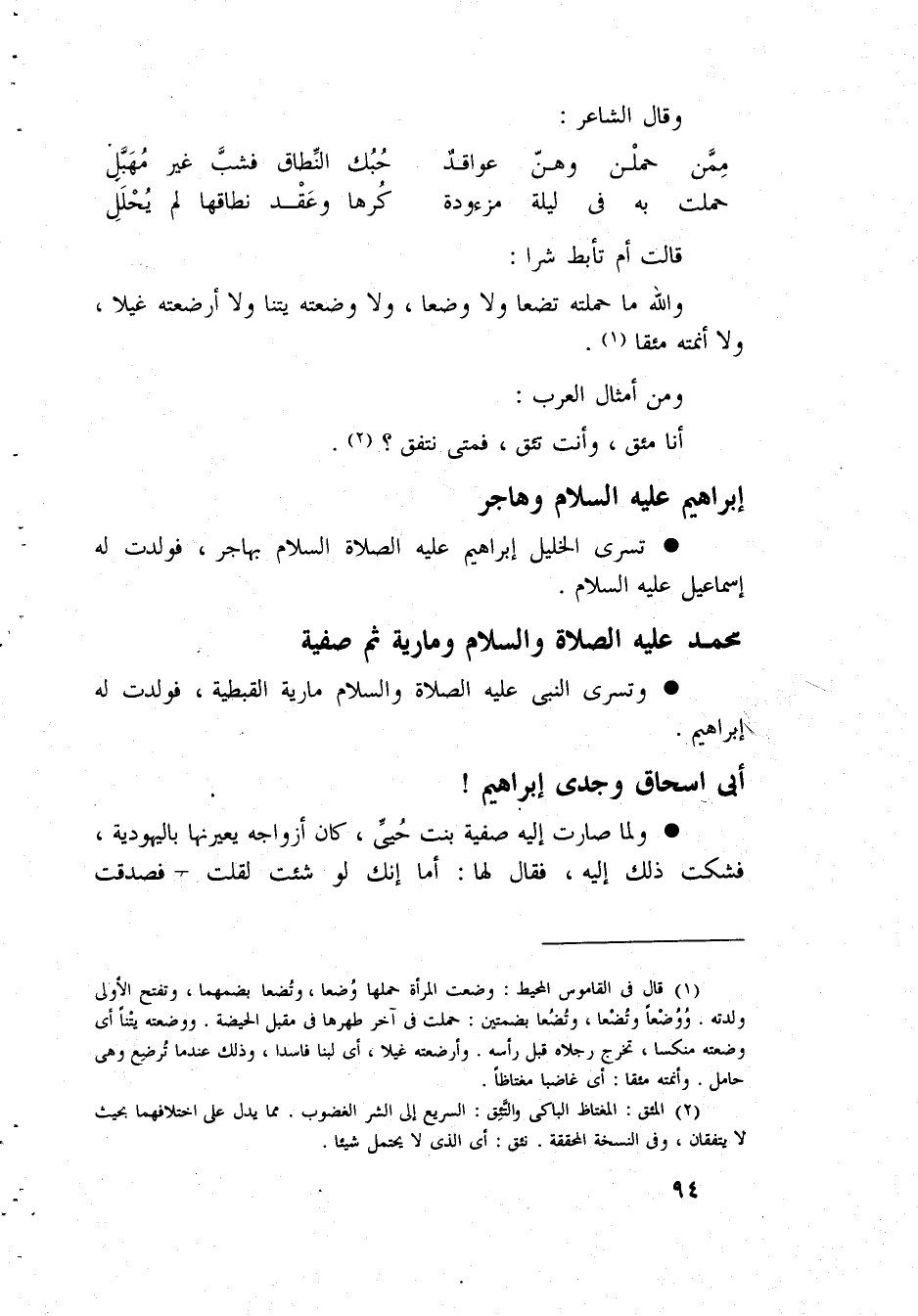 وَقَالَ الشَّاعِر مِمَّن حملن وَهن عواقد حبك النطاق فشب غير مهبل حملت بِهِ فى لَيْلَة مزءودة كرها وَعقد نطاقها لم يحلل قَالَت أم تأبط شرا وَالله مَا حَملته تضعا وَلَا وضعا وَلَا وَضعته يتنا وَلَا أَرْضَعَتْه غيلا وَلَا أنمته مئقا وَمن أَمْثَال الْعَرَب أَنا مئق وَأَنت تئق فَمَتَى نتفق إِبْرَاهِيم عَلَيْهِ السَّلَام وَهَاجَر تسرى الْخَلِيل عَلَيْهِ الصَّلَاة وَالسَّلَام بهاجر فَولدت لَهُ إِسْمَاعِيل عَلَيْهِ السَّلَام مُحَمَّد عَلَيْهِ الصَّلَاة وَالسَّلَام ومارية ثمَّ صَفِيَّة وتسرى النَّبِي عَلَيْهِ الصَّلَاة وَالسَّلَام مَارِيَة الْقبْطِيَّة فَولدت لَهُ إِبْرَاهِيم أَبى اسحاق وجدى إِبْرَاهِيم وَلما صَارَت إِلَيْهِ صَفِيَّة بنت حييّ كَانَ أَزوَاجه يعيرنها باليهودية فشكت ذَلِك إِلَيْهِ فَقَالَ لَهَا أما إِنَّك لَو شِئْت لَقلت فصدقت