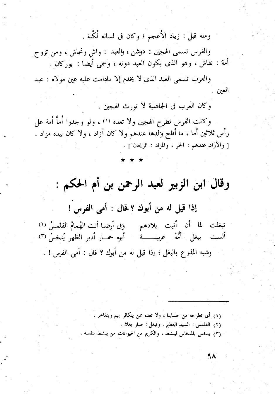 وَمِنْه قيل زِيَاد الْأَعْجَم وَكَانَ فِي لِسَانه لكنة وَالْفرس تسمى الهجين دوشن وَالْعَبْد واش ونجاش وَمن تزوج أمة نفاش وَهُوَ الَّذِي يكون العَبْد دونه وسمى أَيْضا بوركان وَالْعرب تسمى العَبْد الَّذِي لَا يخْدم إِلَّا مادامت عَلَيْهِ عين مَوْلَاهُ عبد الْعين وَكَانَ الْعَرَب فى الْجَاهِلِيَّة لَا تورث الهجين وَكَانَت الْفرس تطرح الهجين وَلَا تعده وَلَو وجدوا أما أمة على رَأس ثَلَاثِينَ أما مَا أَفْلح وَلَدهَا عِنْدهم وَلَا كَانَ آزاد وَلَا كَانَ بِيَدِهِ مزاد والآزاد عِنْدهم الْحر والمزاد الريحان وَقَالَ ابْن الزبير لعبد الرَّحْمَن بن أم الحكم إِذا قيل لَهُ من أَبوك قَالَ أمى الْفرس تبغلت لما أتيت بِلَادهمْ وَفِي أَرْضنَا أَنْت الْهمام القلمس أَلَسْت ببغل أمه عَرَبِيَّة أَبوهُ حمَار أدبر الظّهْر ينخس وَشبه المذرع بالبغل إِذا قيل لَهُ من أَبوك قَالَ أمى الْفرس