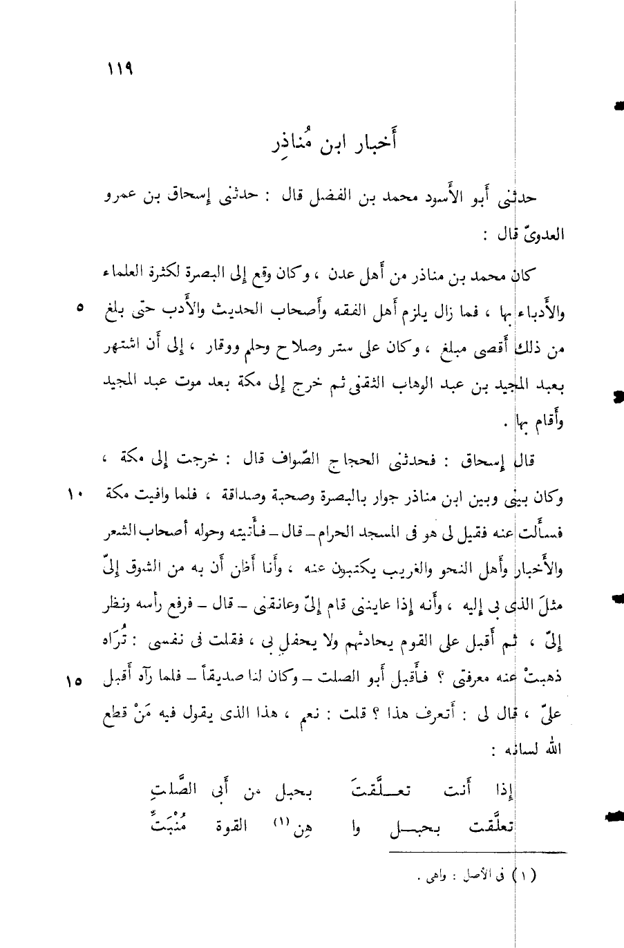 قال إسحاق: فحدثني الحجاج الصواف قال: خرجت إلى مكة، وكان بيني وبين ابن مناذر بالبصرة وصحبة وصداقة، فلما وافيت مكة فسألت عنه فقيل لي هو في المسجد الحرام - قال - فأتيته وحوله أصحاب الشعر والأخبار وأهل النحو والغريب يكتبون عنه، وأنا أظن أن به من الشوق إليّ مثل الذي بي إليه، وأنه إذا عاينني قام إلي وعانقني - قال - فرفع رأسه ونظر إليّ، ثم أقبل على القوم يحادثهم ولا يحفل لي، فقلت في نفسي: تراه ذهبت عنه معرفتي؟ فأقبل أبو الصلت - وكان لنا صديقاً - فلما رآه أقبل عليّ، قال لي: أتعرف هذا؟ قلت: نعم، هذا الذي يقول فيه من قطع الله لسانه: