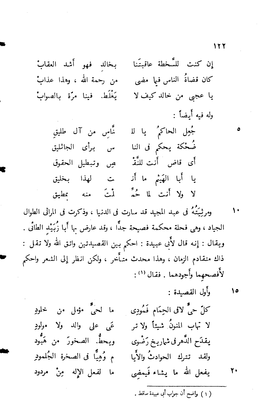 ومرثيته في عبد المجيد قد سارت في الدنيا وذكرت في المراثي الطوال الجياد، وهي فحلة محكمة فصيحة جداً، وقد عارض بها أبا زبيد الطائي. ويقال: إنه قال لأبي عبيدة: احكم بين القصيدتين واتق الله ولا تقل: ذاك متقادم الزمان، وهذا محدث متأخر، ولكن انظر إلى الشعر واحكم لأفصحهما وأجودهما. فقال: