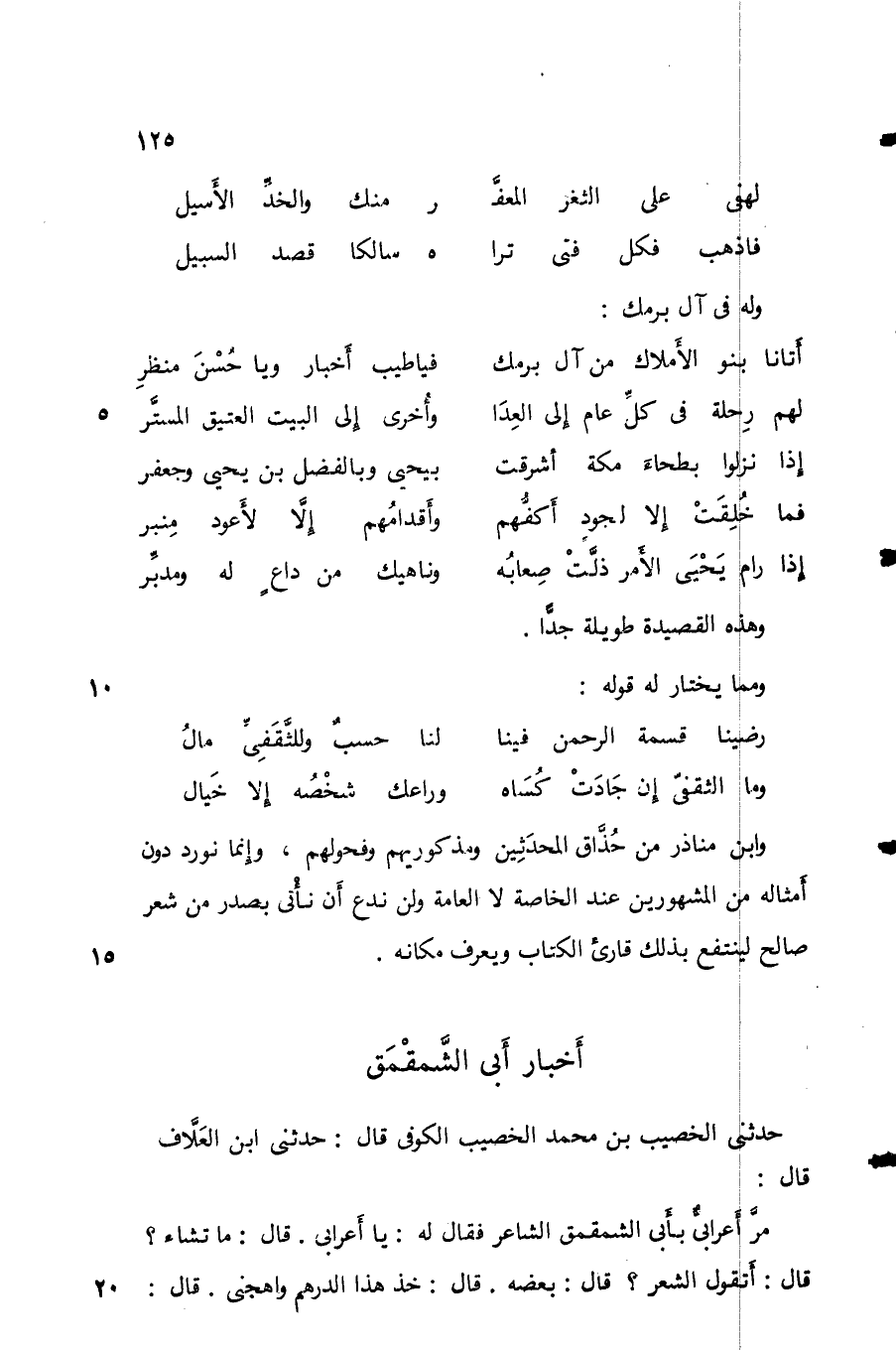 حدثني الخصيب بن محمد الكوفي قال: حدثني ابن العلاف قال: مر أعرابي بأبي الشمقمق الشاعر فقال له: يا أعرابي. قال: ما تشاء؟ قال: أتقول الشعر؟ قال: بعضه، قال: خذ هذا الدرهم واهجني. قال: