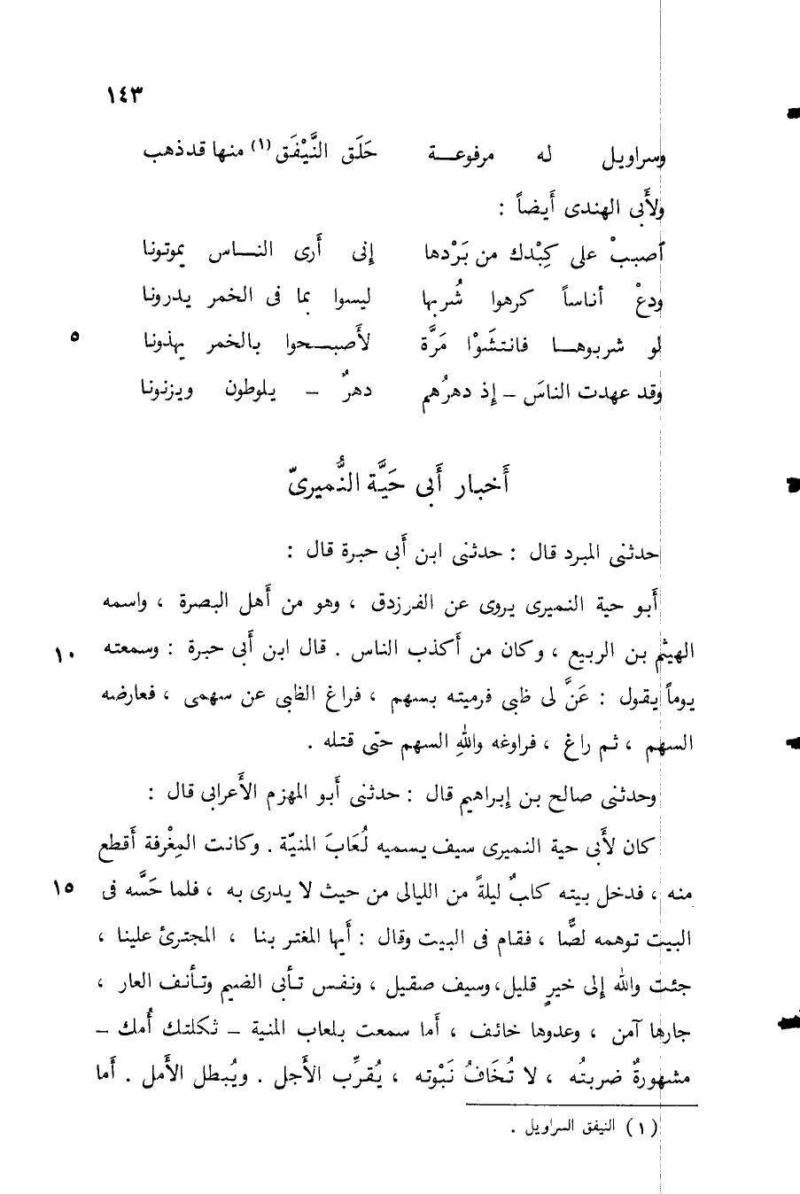 حدثني المبرد قال: حدَّثني ابن أبي حبرة قال: أبو حية النميري يروي عن الفرزدق، وهو من أهل البصرة، واسمه الهيثم بن الربيع، وكان من أكذب الناس. قال ابن أبي حبرة: وسمعته يوماً يقول: عن لي ظبي فرميته بسهم، فراغ الظبي عن سهمي، فعارضه السهم، ثم راغ، فراوغه والله السهم حتى قتله.