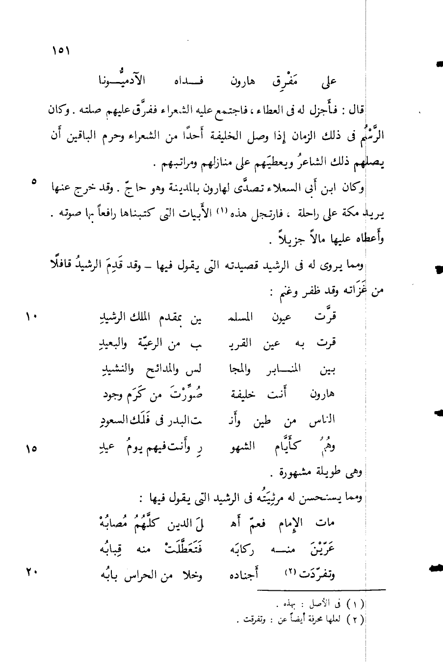 وكان ابن أبي السعلاء تصدى لهارون بالمدينة وهو حاج. وقد خرج عنها يريد مكة على راحلة، فارتجل هذه الأبيات التي كتبناها رافعاً بها صوته. وأعطاه عليها مالاً جزيلاً.