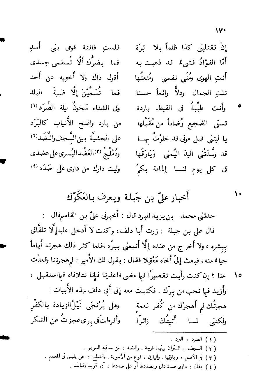 حدَّثني محمد بن يزيد المبرد قال: أخبرني علي بن القاسم قال: قال علي بن جبلة: زرت أبا دلف، وكنت لا أدخل عليه إلا تلقاني ببشره، ولا أخرج من عنده إلا أتبعني ببره، فلما كثر ذلك هجرته أياماً حياء منه، فبعث إلي أخاه معقلاً فقال: يقول لك الأمير: لم هجرتنا وقعدت عنا؟ إن كنت رأيت تقصيراً فيما مضى فاعذرنا فإنا نتلافاه فيما استقبل، وأزيد فيما تحب من برك، فكتبت معه إلى أبي دلف بهذه الأبيات: