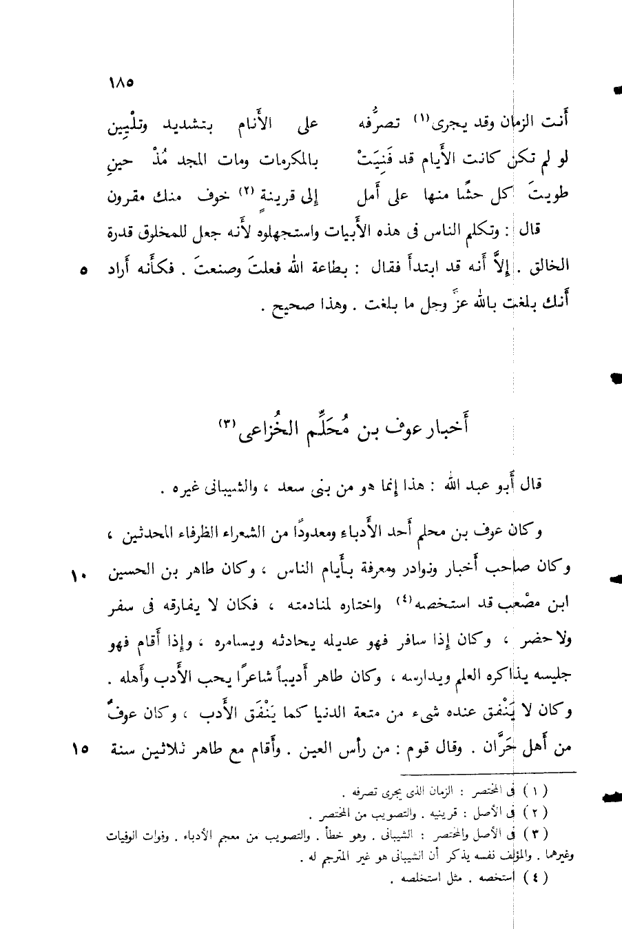 وكان صاحب أخبار ونوادر ومعرفة بأيام الناس، وكان طاهر بن الحسين ابن مصعب قد استخصه واختاره لمنادمته، فكان لا يفارقه في سفر ولا حضر، وكان إذا سافر فهو عديله يحادثه ويسامره، وإذا أقام فهو جليسه يذاكره العلم ويدارسه، وكان طاهراً أديباً شاعراً يحب الأدب وأهله. وكان لا ينفق عنده شيء من متعة الدنيا كما ينفق الأدب، وكان عوف من أهل حران. وقال قوم: من رأس العين. وأقام مع طاهر ثلاثين سنة