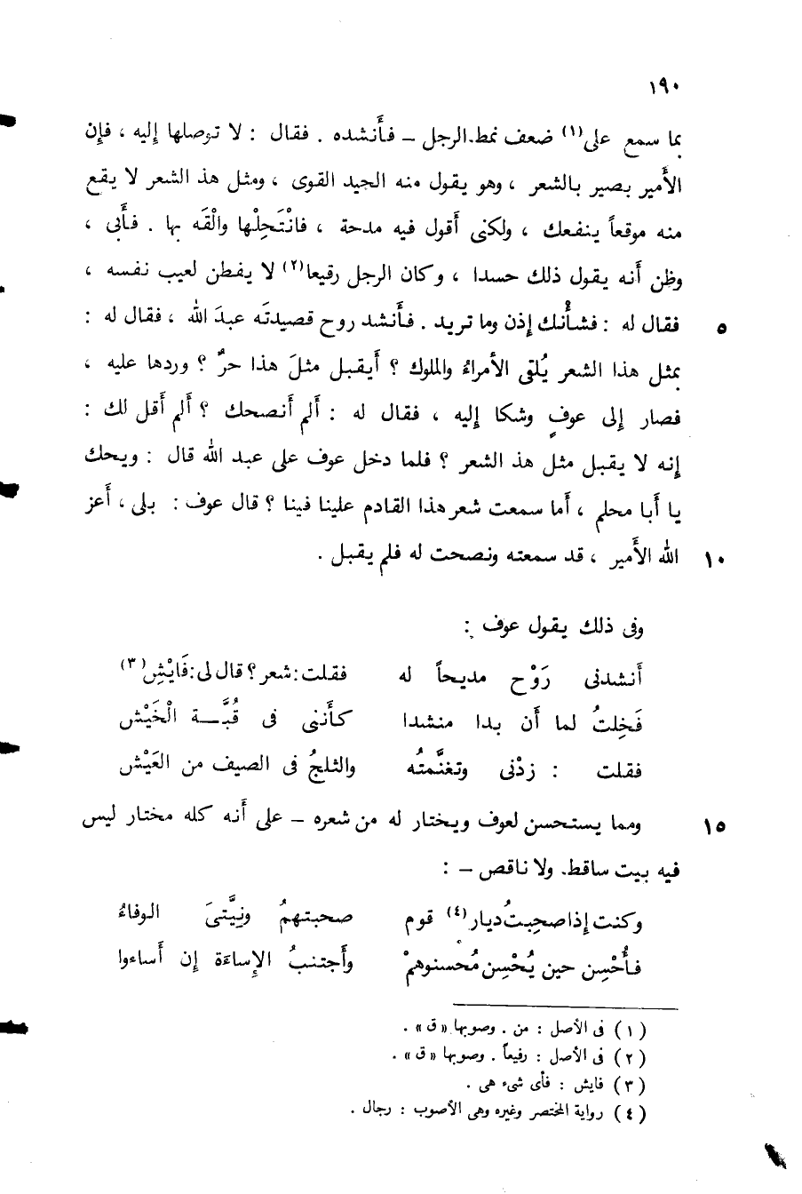 بما سمع على ضعف نمط الرجل - فأنشده. فقال: لا توصلها إليه، فإن الأمير بصير بالشعر، وهو يقول منه الجيد القوي، ومثل هذا الشعر لا يقع منه موقعاً ينفعك، ولكني أقول فيه مدحه، فانتحلها والقه بها. فأبى، وظن أنه يقول ذلك حسداً، وكان الرجل رقيعاً لا يفطن لعيب نفسه، فقال له: فشأنك إذن وما تريد. فأنشد روح قصيدته عبد الله، فقال له: بمثل هذا الشعر يلقى الأمراء والملوك؟ أيقبل مثل هذا حر؟ وردها عليه، فصار إلى عوف وشكا إليه، فقال له: ألم أنصحك؟ ألم أقل لك: إنه لا يقبل مثل هذا الشعر؟ فلما دخل عوف على عبد الله قال: ويحك يا أبا ملحم، أما سمعت شعر هذا القادم علينا فينا؟ قال عوف: بلى، أعز الله الأمير، قد سمعته ونصحت له فلم يقبل.