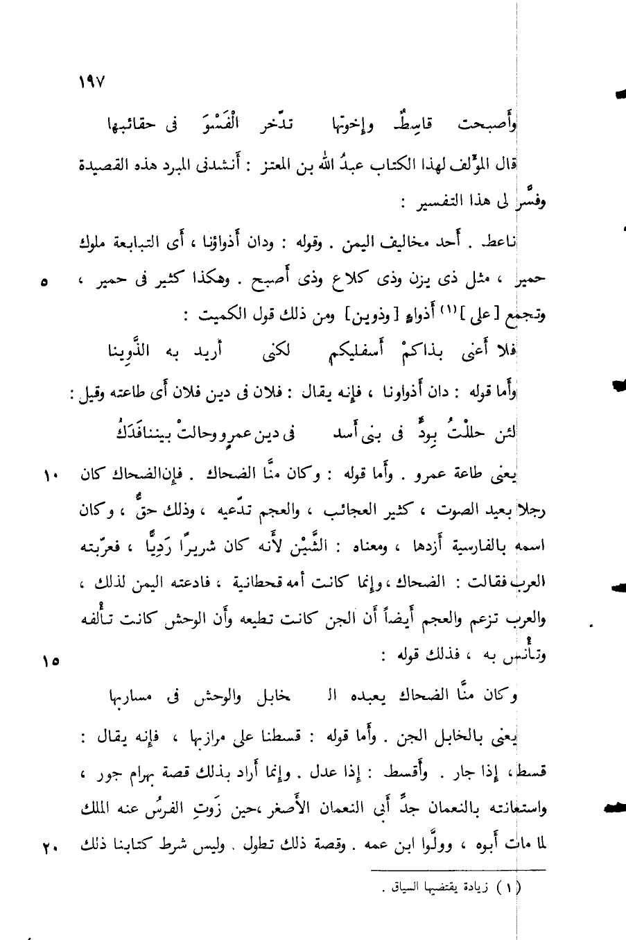 قال المؤلف لهذا الكتاب عبد الله بن المعتز: أنشدني المبرد هذه القصيدة وفسر لي هذا التفسير: ناعط. أحد مخاليف اليمن. وقوله: ودان أذواؤنا، أي التبايعة ملوك حمير، مثل ذي يزن وذي كلاع وذي أصبح. وهكذا كثير في حمير، وتجمع على أذواء وذوين ومن ذلك قول الكميت: