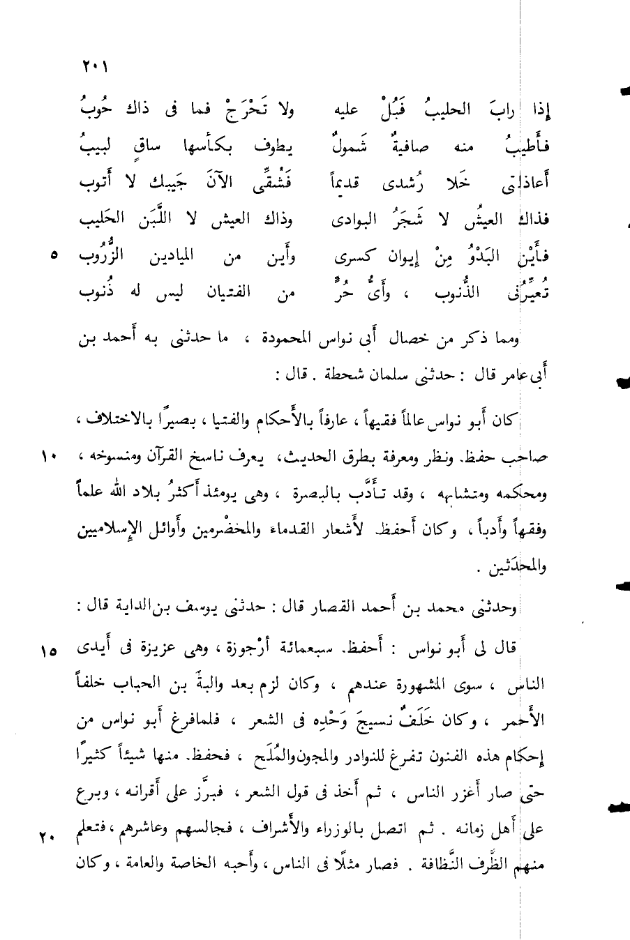 ومما ذكر من خصال أبي نواس المحمودة، ما حدثني به أحمد بن أبي عامر قال: حدثني سلمان شحطة. قال: كان أبو نواس عالماً فقيهاً، عارفاً بالأحكام والفتيا، بصيراً بالاختلاف، صاحب حفظ. ونظر ومعرفة بطرق الحديث، يعرف ناسخ القرآن ومنسوخه، ومحكمه ومتشابهه، وقد تأدب بالبصرة، وهي يومئذ أكثر بلاد الله علماً وفقهاً وأدباً، وكان أحفظ لأشعار القدماء والمخضرمين وأوائل الإسلاميين والمحدثين.